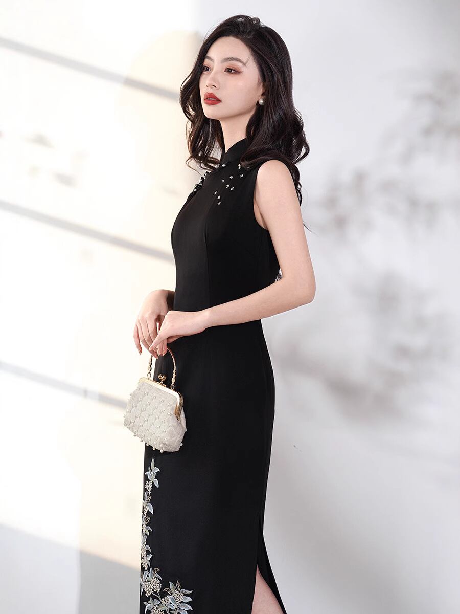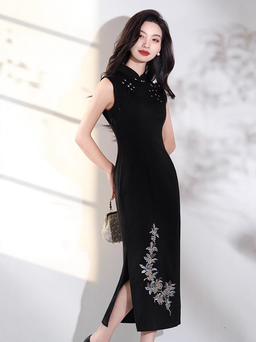 チャイナドレス レディース 新チャイニーズスタイル 改良 ロング丈 ノースリーブ ブラック 刺繍 半開襟 スタンドカラー 上品 エレガント オケージョン 結婚式 春夏