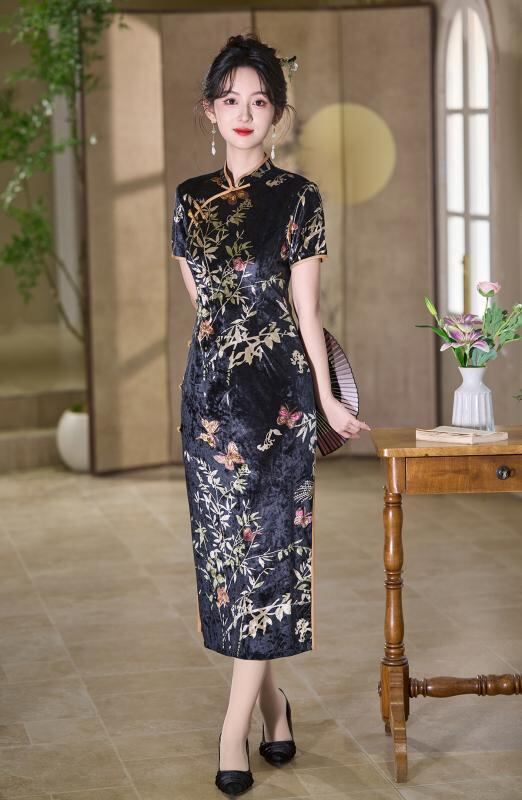 面料名称: ベルベット, 主な生地の組成: スパンデックス, 主な生地の組成2: ポリエステル, チャイナドレスの丈: ロング, 襟のタイプ: スタンドカラー, 襟合わせのタイプ: 斜め, 袖丈: 半袖, スリット: ロー, 要素: ジッパー, カラー: ブラック, サイズ: M,L,XL,XXL,XXXL,4XL, チャイナドレスのスタイル: 単品, スタイル: チャイナ風, スタイルタイプ: レトロモダン, 伸縮性: ややあり, 性別: 女性, 袖のタイプ: 通常袖, 加工: アイロン不要