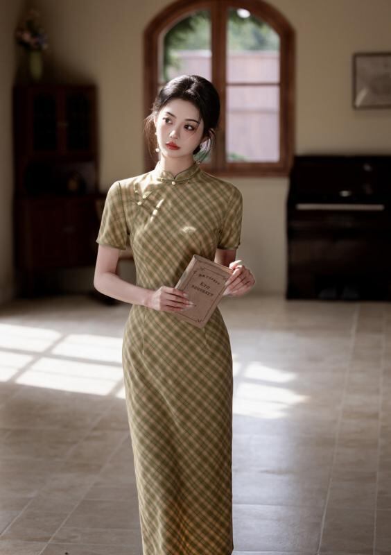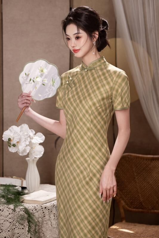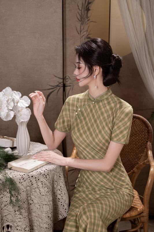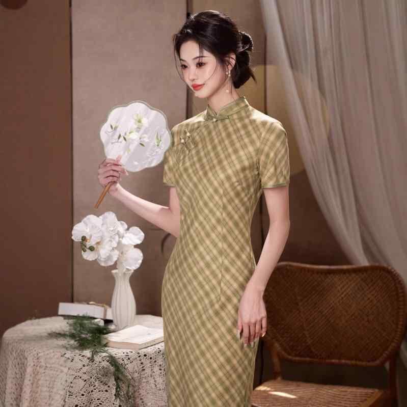 チャイナドレス レディース フェミニン スタイリッシュ 清新 緑色 グリーン 格子柄 チェック柄 和風 モダン 少女向け スタイルアップ スリム 痩せ見え 新 ワンピース