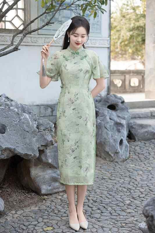 チャイナドレス レディース フェミニン スタイリッシュ 中華風 チャイナ風 モダン チーパオ 夏用 若々しい女性 10代 20代 魅惑的 エレガント 半袖 着痩せ ワンピース ドレス