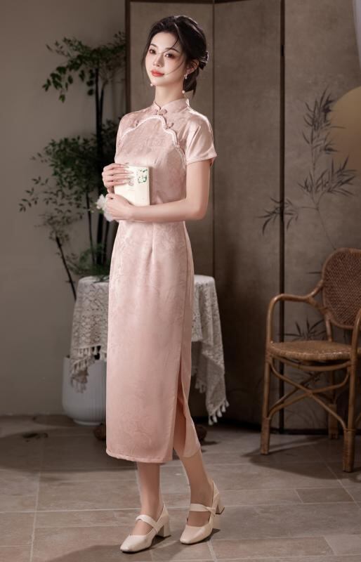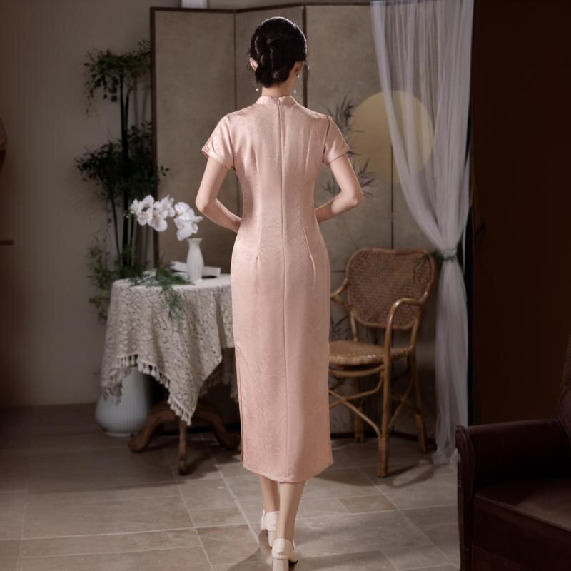 チャイナドレス レディース ピンク 改良版 ウエストシェイプ 細見え 日常使い 春夏 ポリエステル 再生繊維サテン スタンドカラー 斜め襟 低スリット 中華風 エレガント 上品 微ストレッチ ジャガード織り