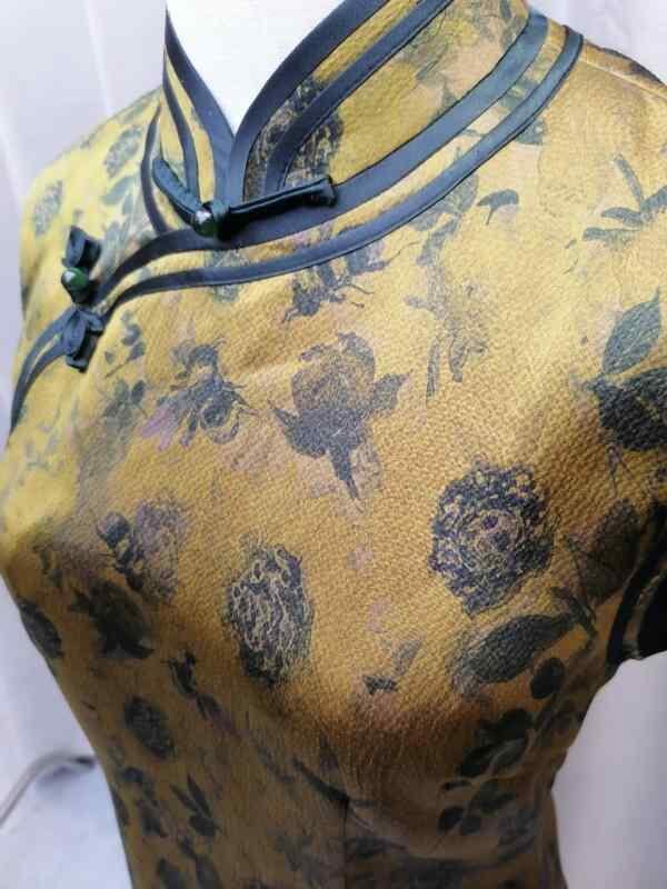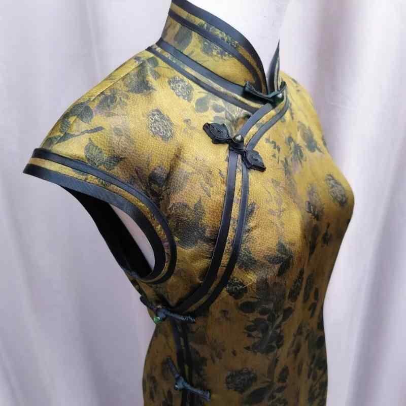 チャイナドレス レディース 女性用 春夏 ロング丈 中国風 レトロ 桑蚕シルク ポリエステル ジャカード織り 高級感 イエロー スタンドカラー 半袖 エレガント ワンピース デイリー