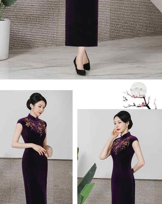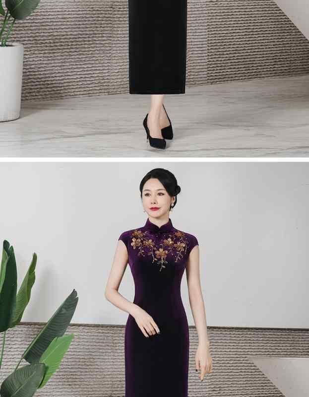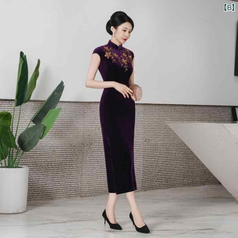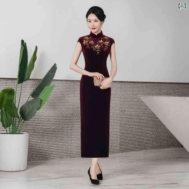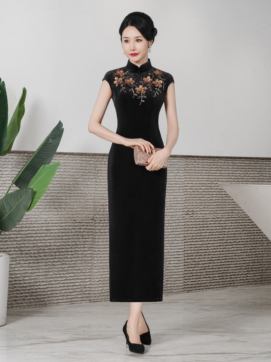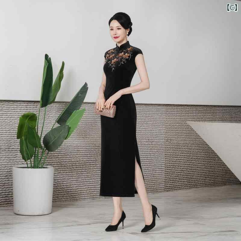 チャイナドレス レディース 春夏 改良デザイン モダン パーティードレス お呼ばれドレス ベロア素材 ストレッチ ロング丈 ノースリーブ スリムシルエット ハイネック スリット入り 花柄 ビーズ装飾