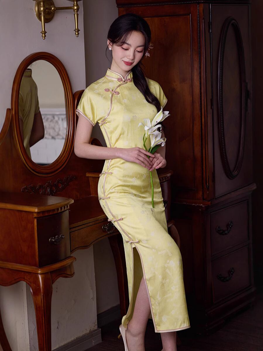 チャイナドレス レディース 春夏 改良 レトロ 再生繊維 洗練 上品 普段使い ロング丈 スタンドカラー 七分袖 ハイ スリット ワンピース シングルレイヤー
