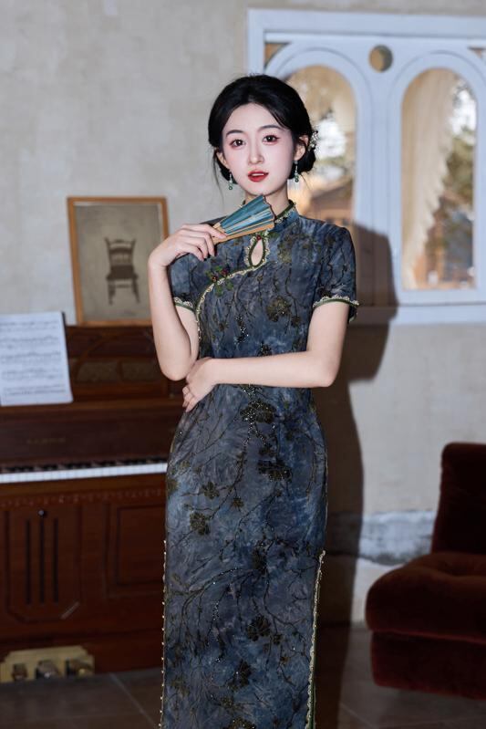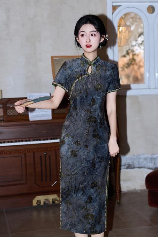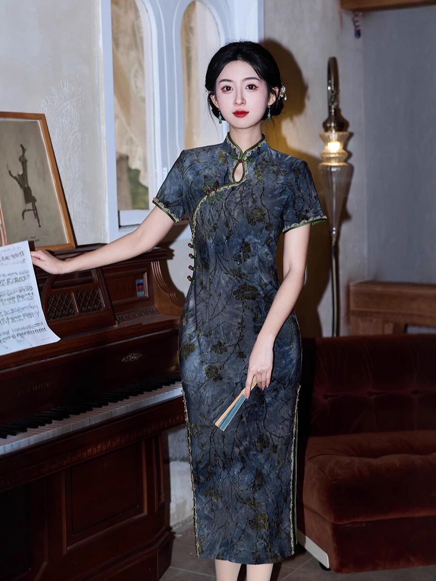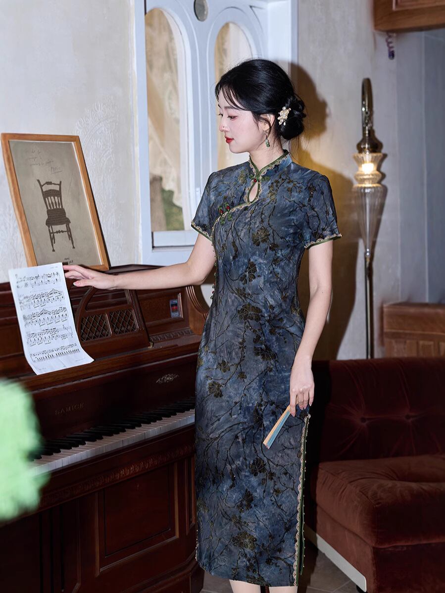 ワンピース レディース 改良チャイナドレス 絞り染め フロッキー加工 箔押し レトロ調 シック エレガント 普段使い ロング丈 スタンドカラー 半袖 スリット入り ポリエステル 春夏