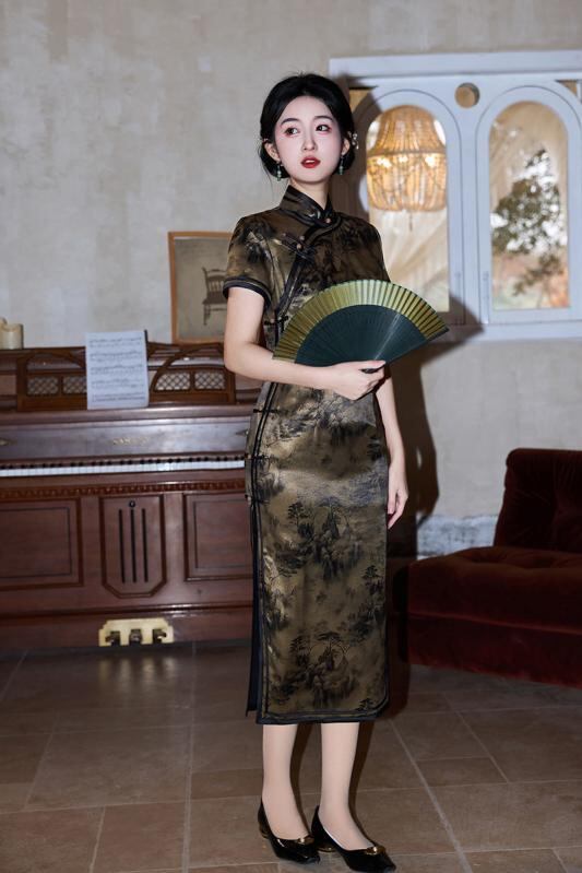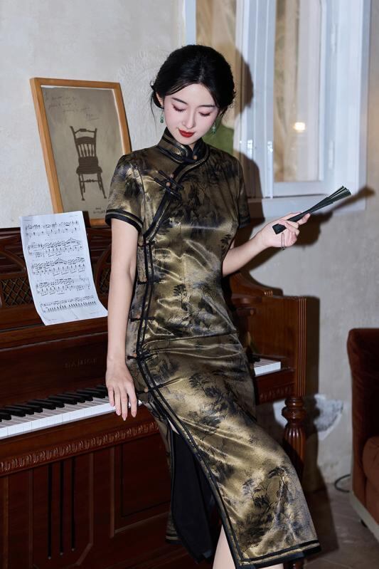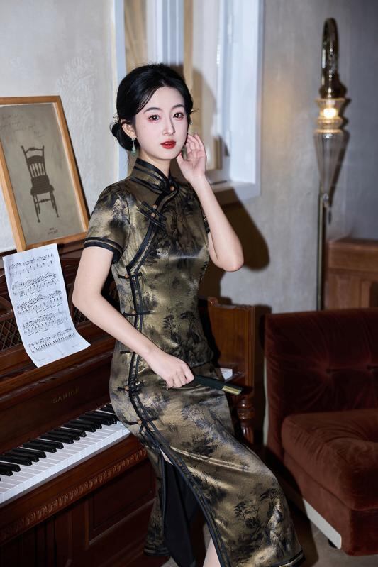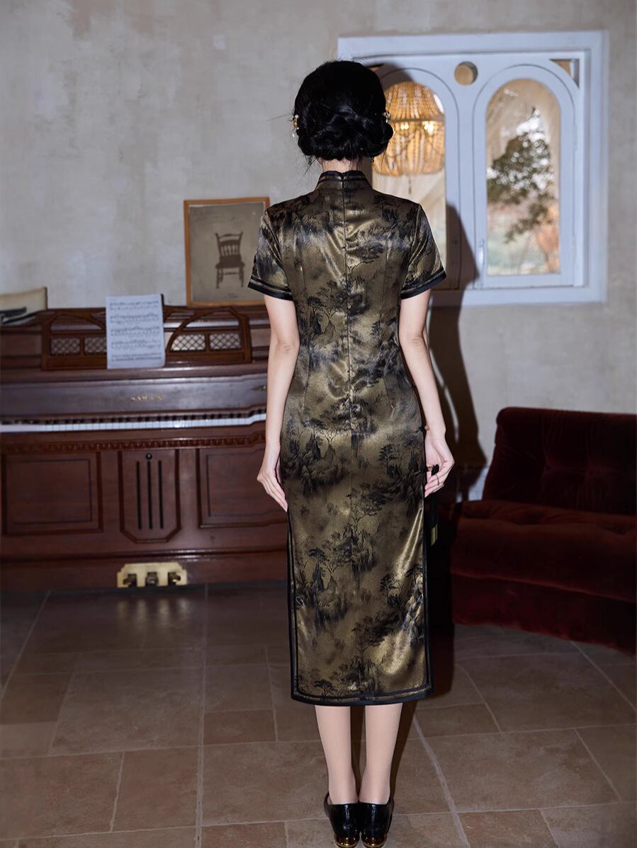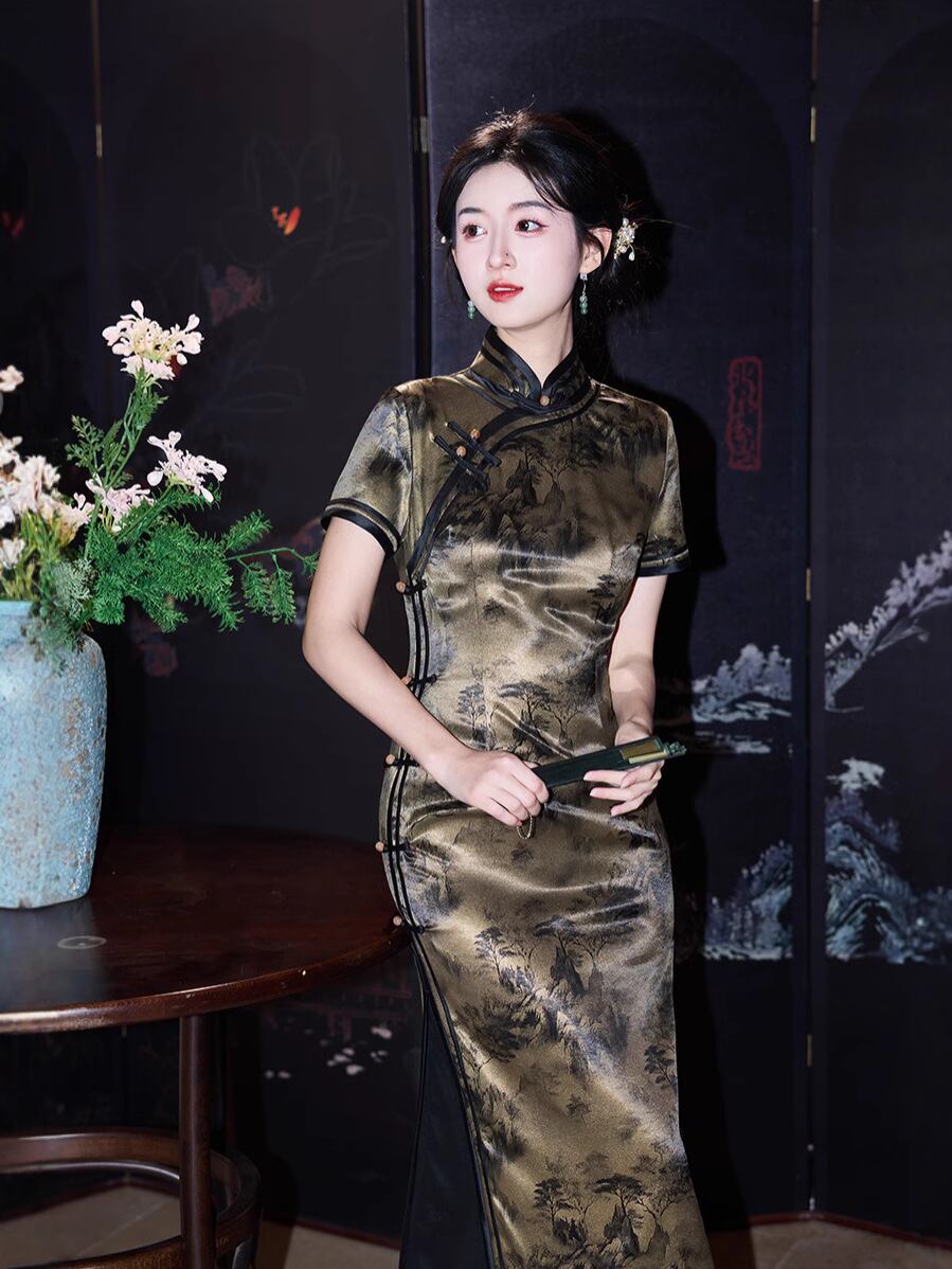 ワンピース レディース 春夏 モダン チャイナドレス サテン プリント レトロ エレガント シック 普段使い デイリー ドレス 立ち襟 スタンドカラー 斜め襟 ポリエステル