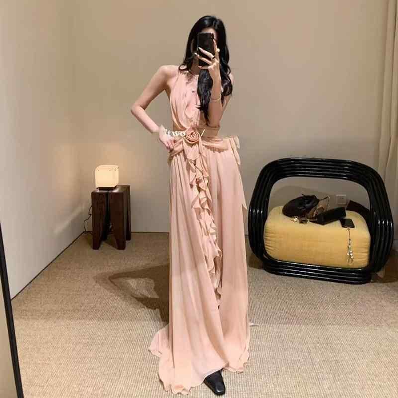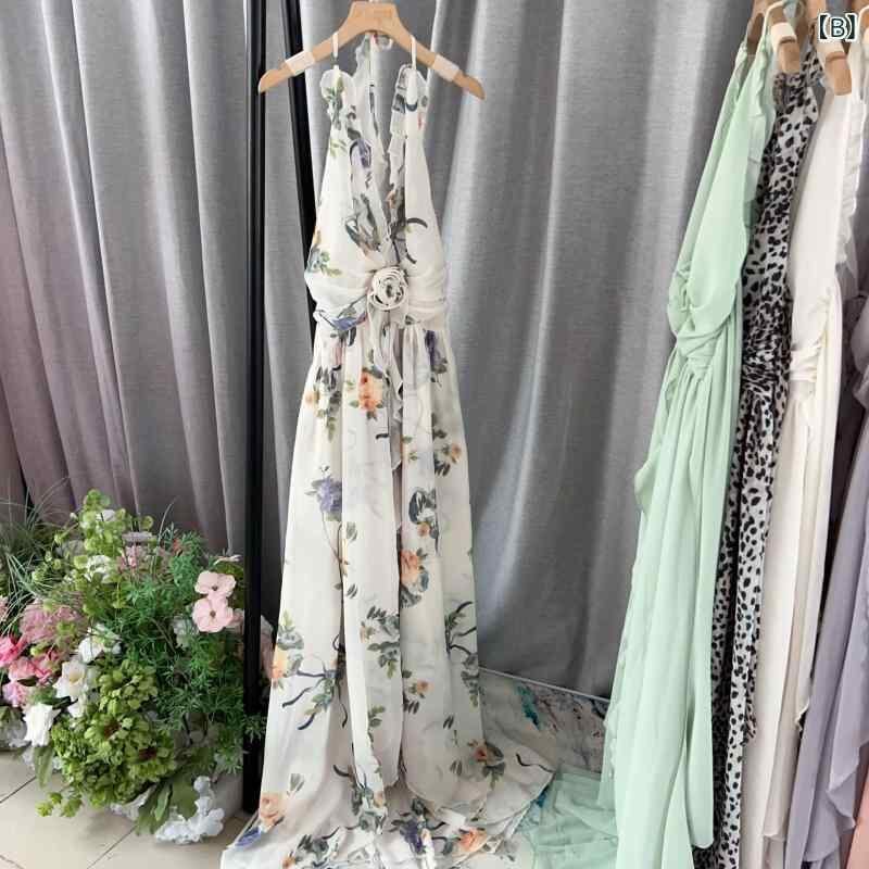 マキシ丈ワンピース ホルターネック バックレス 花柄 ヒョウ柄 エレガント リゾート Vネック ノースリーブ 春夏 ビーチ 旅行 ポリエステル 日韓風 カジュアル 個性的
