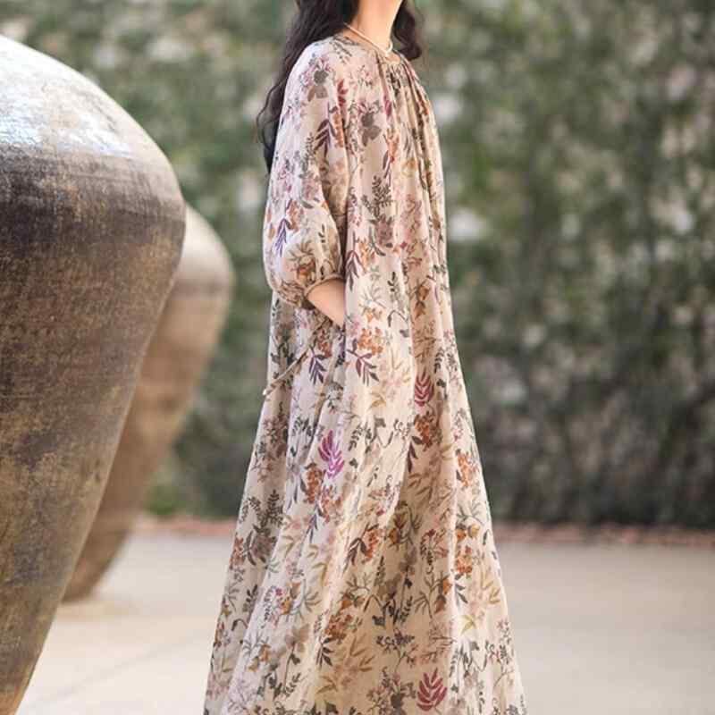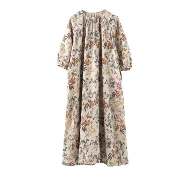 ワンピース レディース 麻100% リネン 春夏 ラグランスリーブ Aライン ミディ丈 7分袖 ラウンドネック ナチュラル カジュアル フェミニン 小花柄 ゆったり 体型カバー ポケット付き