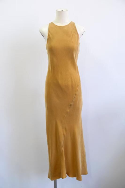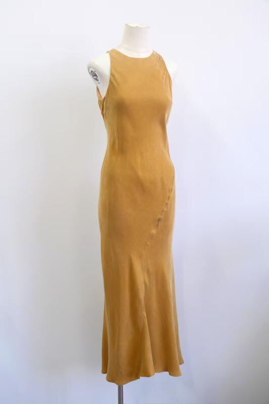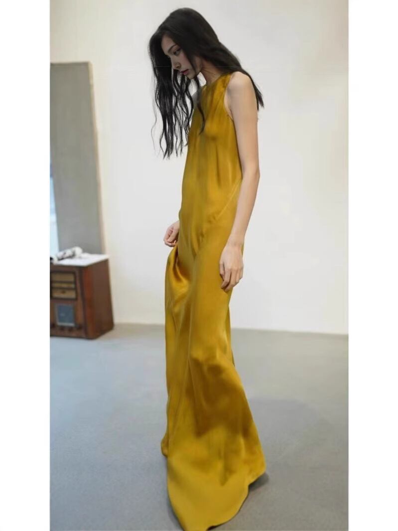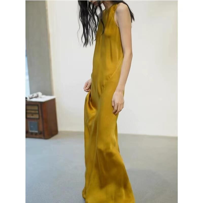 ワンピース レディース ノースリーブ ロング丈 夏 エレガント 上品 高級感 きれいめ 通勤 ハイウエスト ラウンドネック キュプラ混紡 イエロー 無地