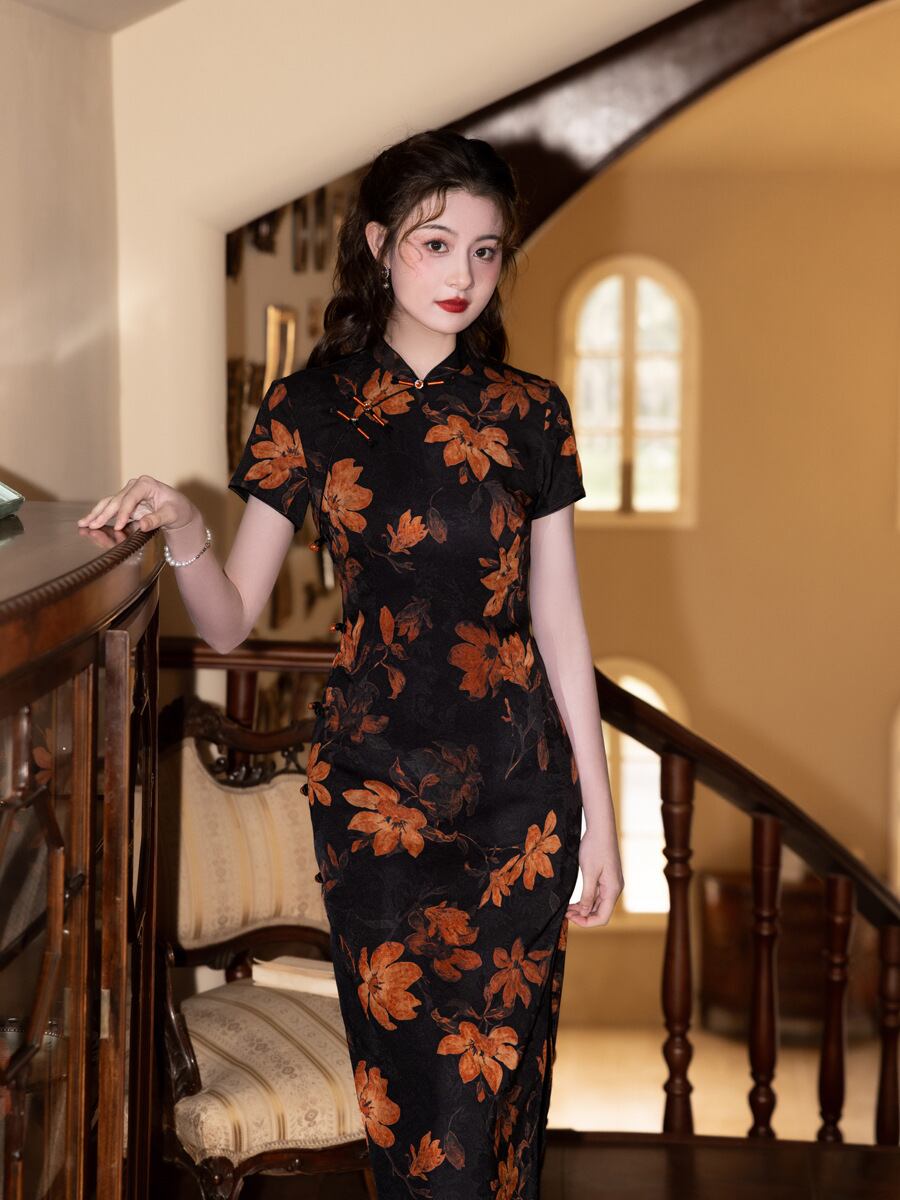 チャイナドレス レディース 高級感 上海レトロ 改良版 黒 エレガント モダンデザイン 普段使い ロング丈 七分袖 スタンドカラー スリット入り ポリエステル ストレッチ素材 春夏