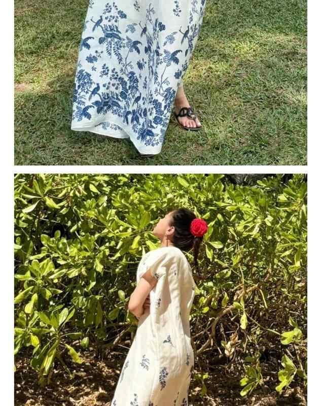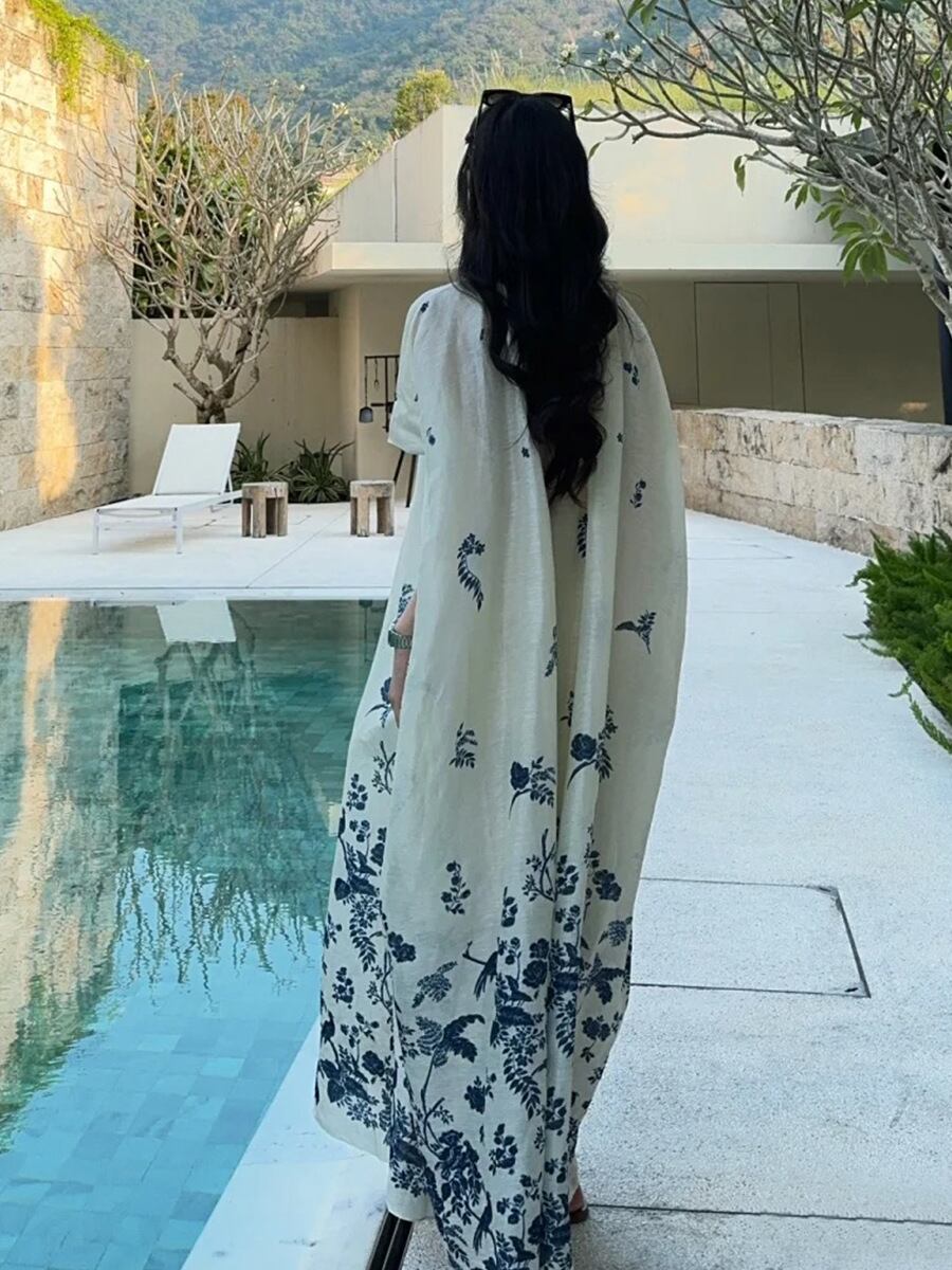 ワンピース レディース シルク 麻 高級感 接触冷感 カジュアル リゾート 花柄 ロング丈 フレア ボヘミアン ビーチドレス 上品 春夏 ホワイト ラウンドネック ノースリーブ