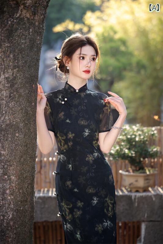 チャイナドレス レディース ワンピース 春夏 ネット メッシュ プリント 二重 長尺 ロング 黒 ブラック 高級感 細身 スリム 着痩せ 現物