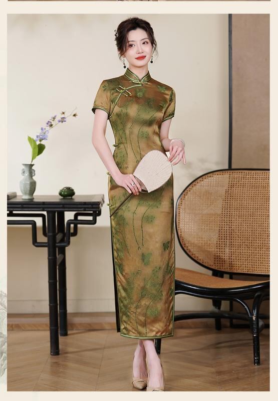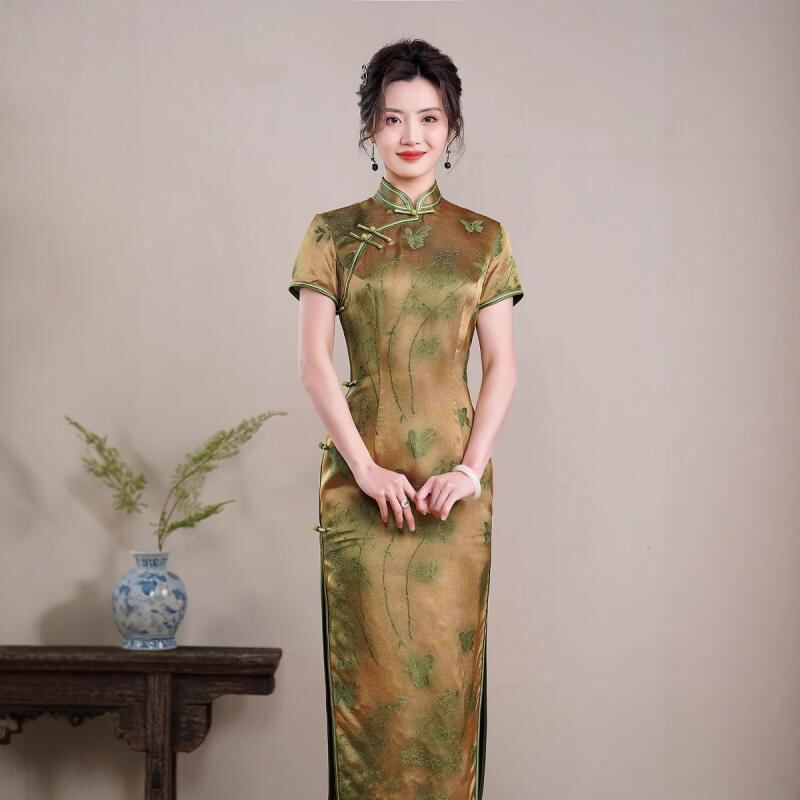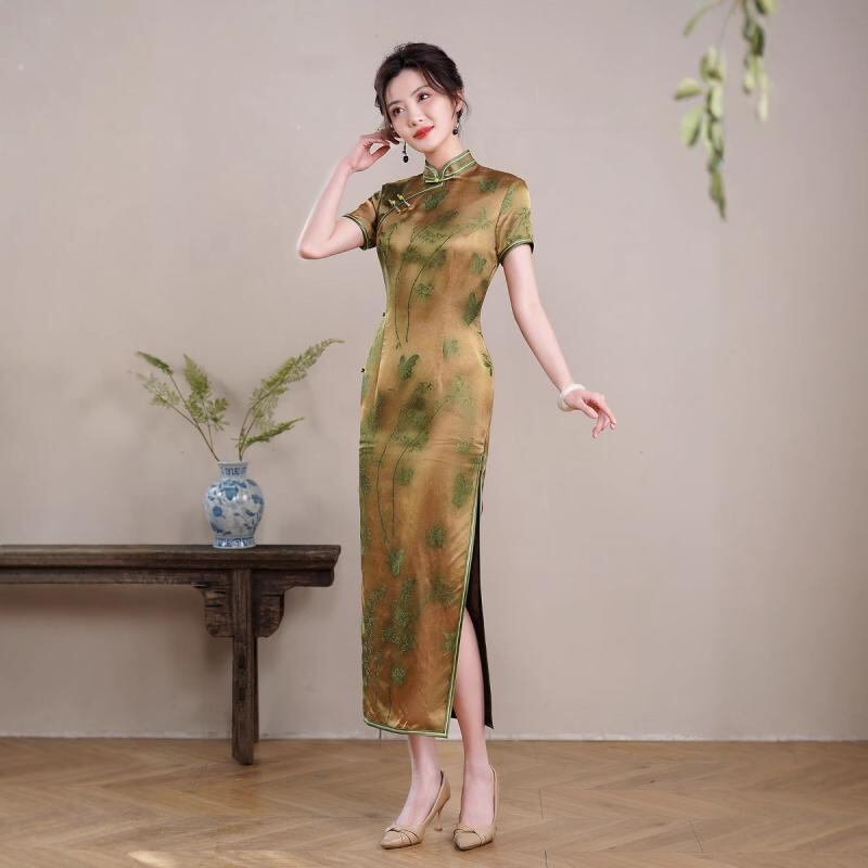 チャイナドレス レディース ロング丈 半袖 スタンドカラー 斜め襟 ハイサイドスリット テンセル リヨセル エレガント おしゃれ 中国風 レトロ 改良 春夏