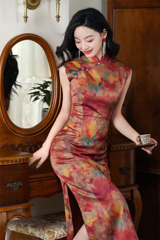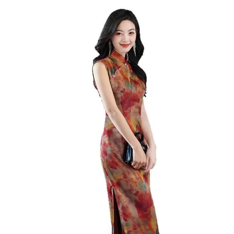 チャイナドレス レディース ロング丈 ノースリーブ ママ 母親 ミセス 結婚式 披露宴 パーティー 春夏 レトロ クラシック 中華風 エレガント 上品 ポリエステル ストレッチ