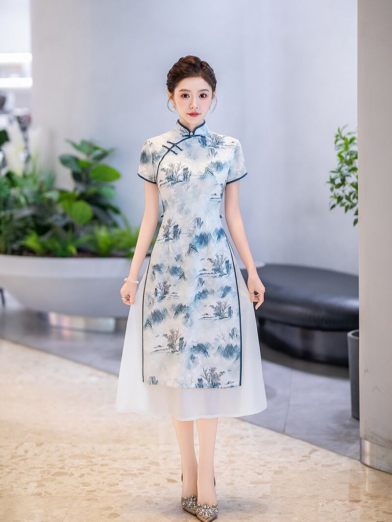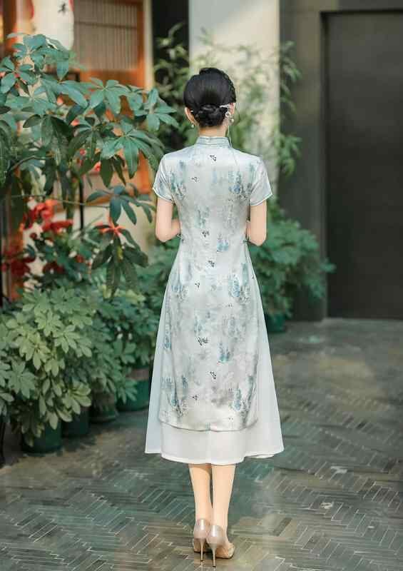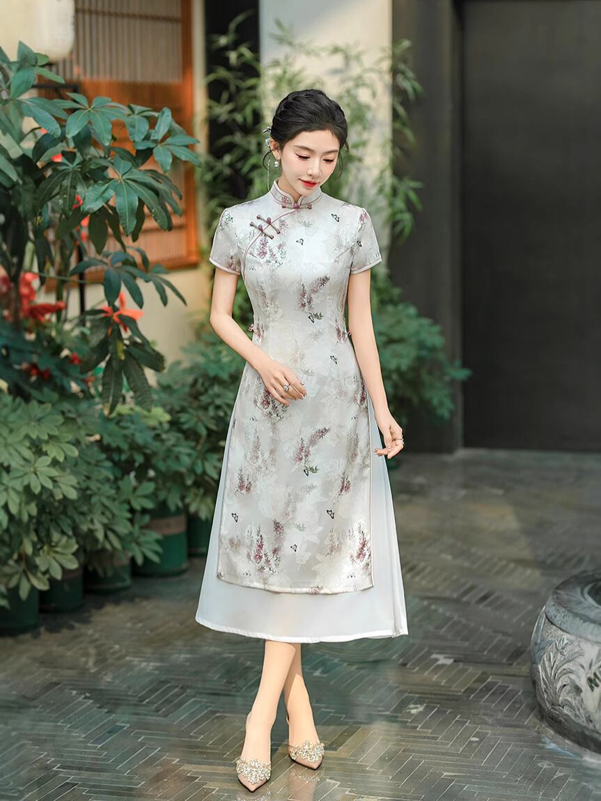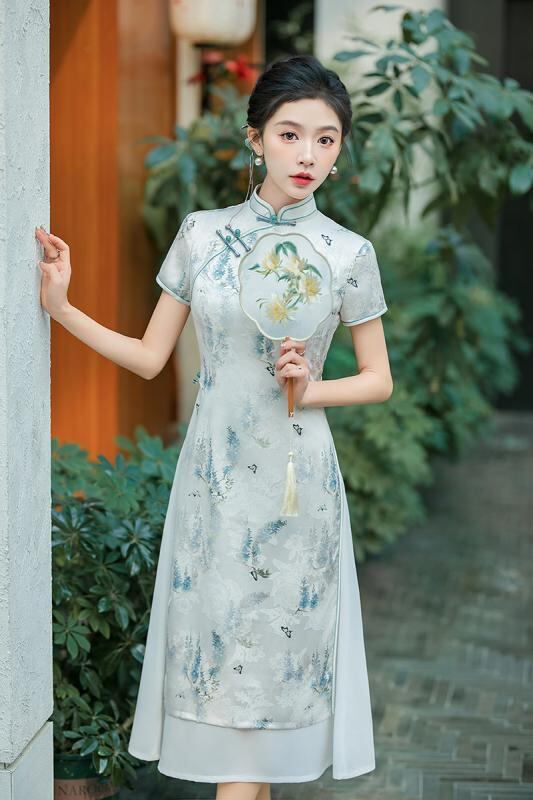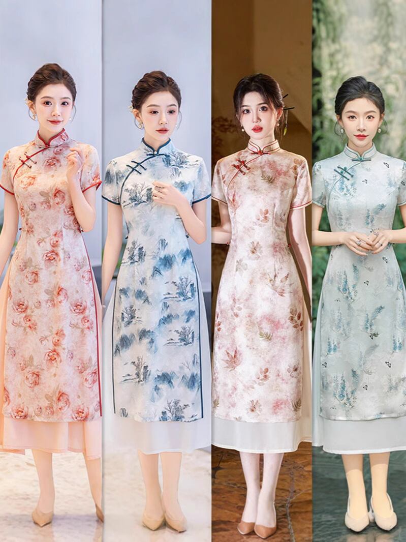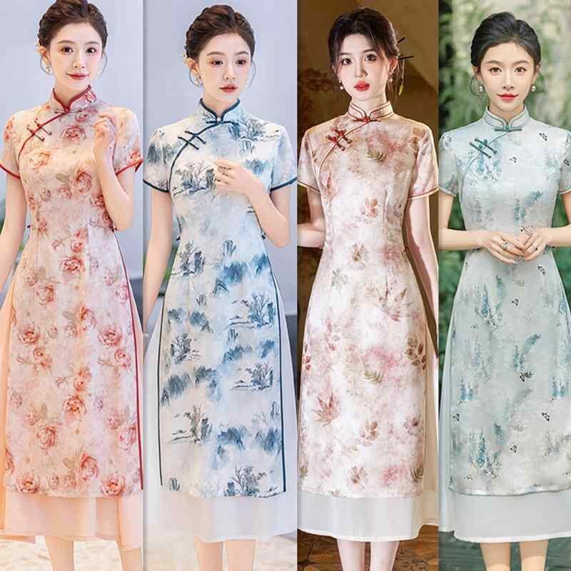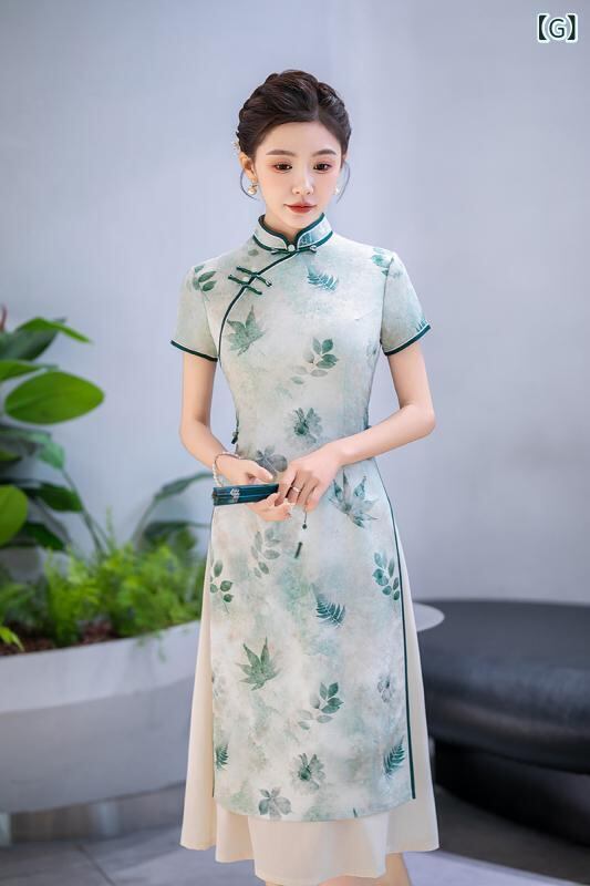 チャイナドレス レディース 女性用 アオザイ 新中国風 レトロ モダン 改良 ロング丈 ワンピース ドレス スタンドカラー 立ち襟 斜め襟 七分袖 ポリエステル スパンデックス ストレッチ 伸縮性 花柄 普段使い デイリー カジュアル 春夏