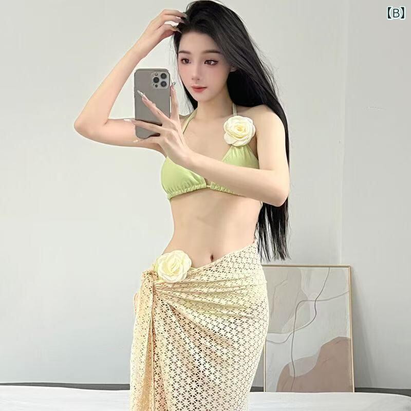 水着 レディース ビキニ セパレート 3点セット 花柄 ロングスカート タイ風 リゾート ビーチ 温泉 海外旅行 夏 体型カバー イエロー グリーン
