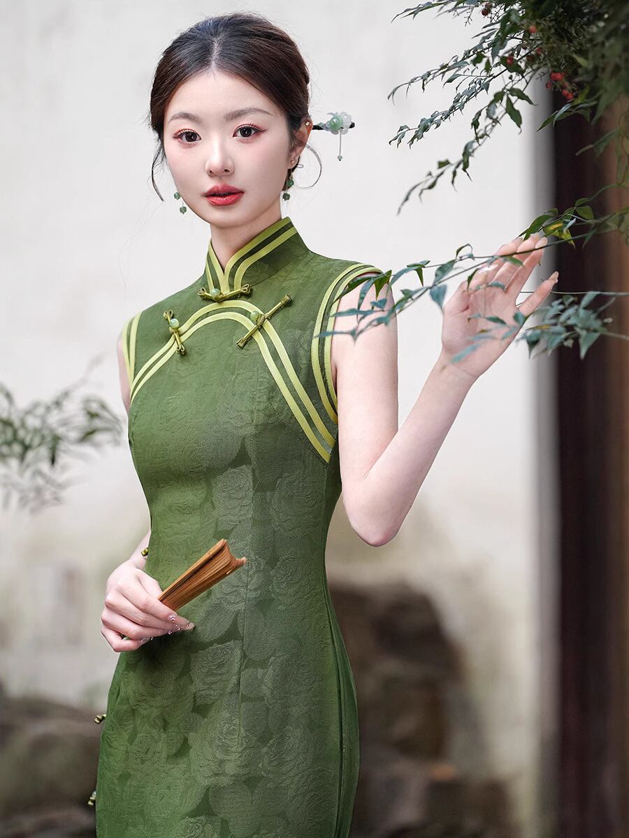チャイナドレス レディース 春夏 ノースリーブ スタンドカラー ダブルラウンドネック スリムフィット ロング丈 新中華風 エレガント ジャガード織り ポリエステル 伸縮性 蘇州風