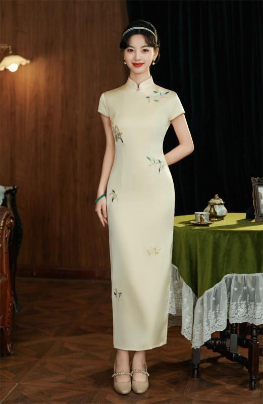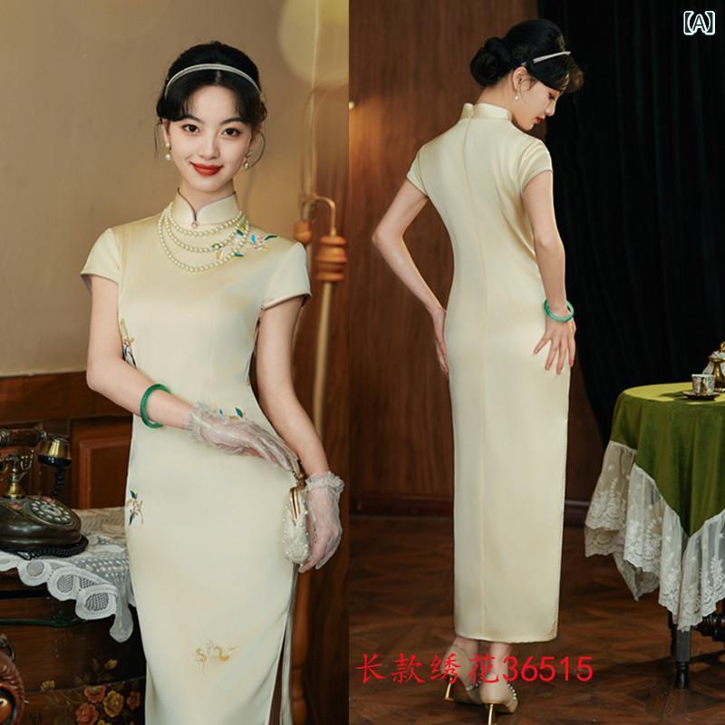 チャイナドレス レディース レトロ 中華風 新チャイナ風 改良 ロング丈 上品 刺繍 立ち襟 ショートスリーブ 伸縮性 春夏 ポリエステル素材