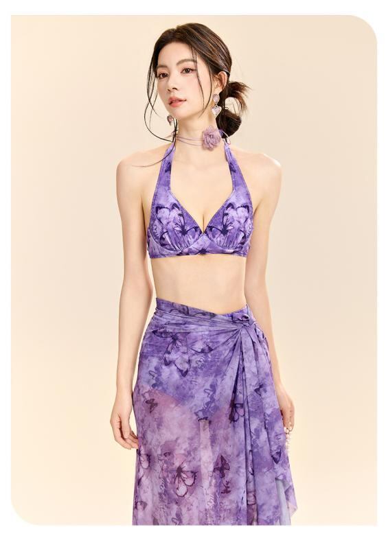 水着 レディース セパレート ビキニ スリーピース ショートパンツ 体型カバー セクシー ワイヤー入り 胸パッド付き 温泉 プール リゾート ポリエステル スパンデックス パープル ブルー