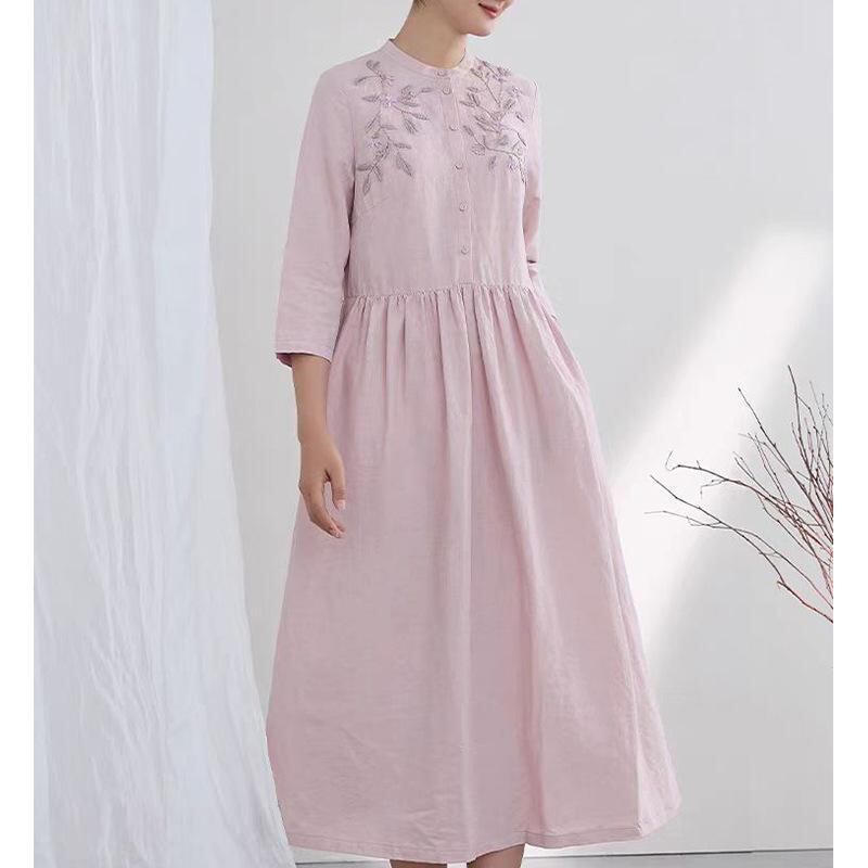 ワンピース レディース 春夏 綿麻 リネン 高級感 刺繡 文芸レトロ ミモレ丈 Aライン セミハイネック 七分袖 花柄 ボタニカル ポケット付き ゆったり ルーズフィット オフピンク カジュアル ドレス 女性用