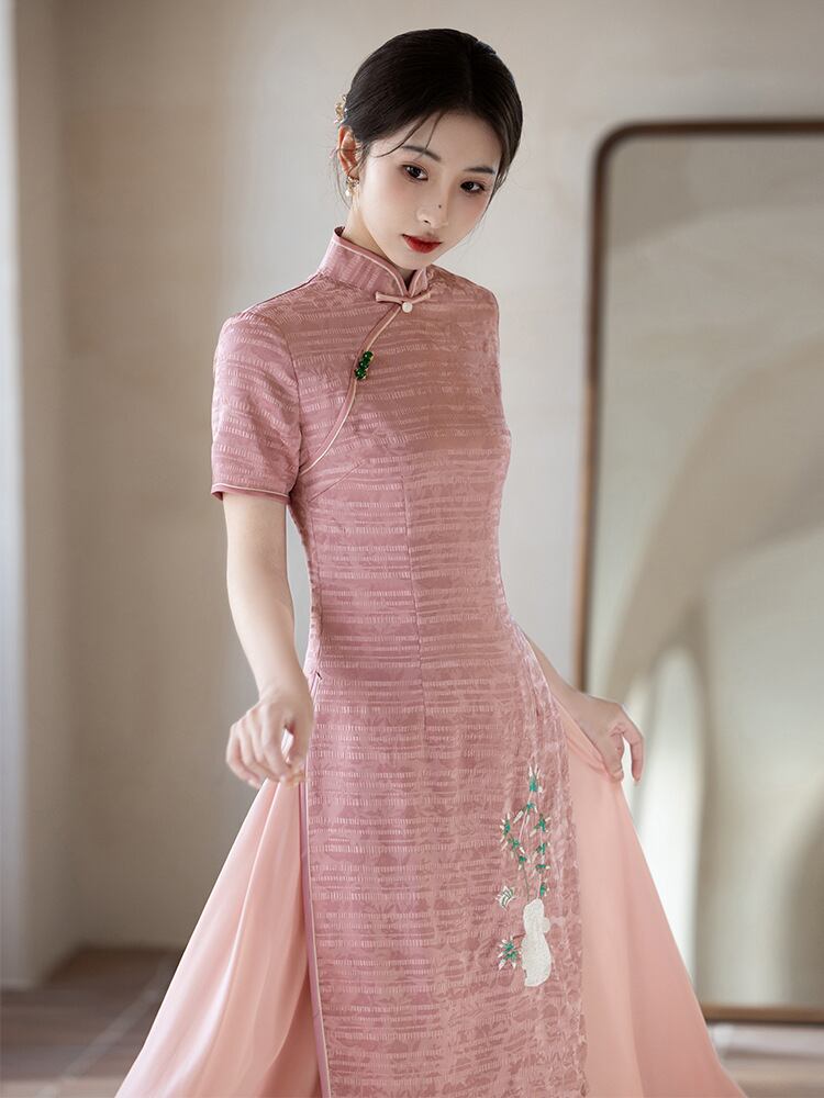 チャイナドレス レディース ピンク 刺繍 新中華風 ロングワンピース 春夏 上品 普段使い スタンドカラー 斜め襟 五分袖 ハイサイドスリット シルク調 レトロモダン