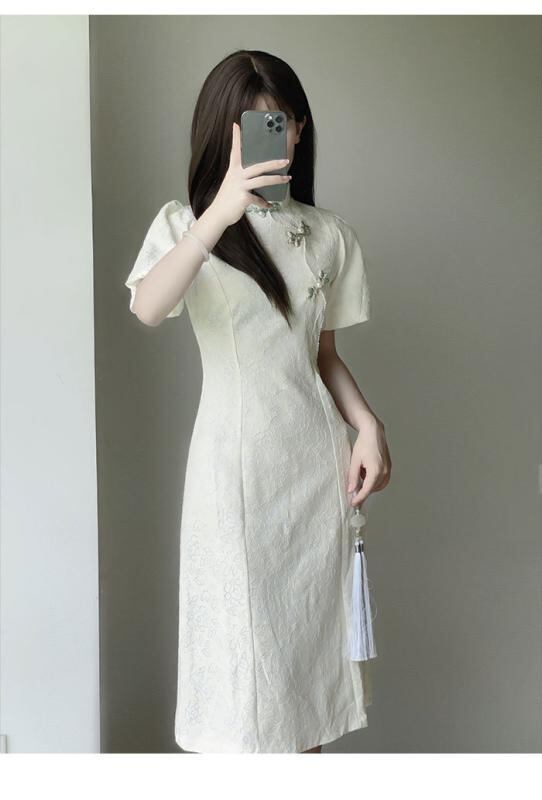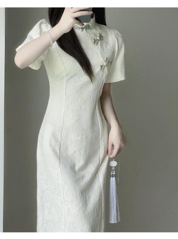 チャイナドレス レディース フェミニン スタイリッシュ レトロ 上品 清楚 プリンセススリーブ 姫袖 パフスリーブ 新中華風 モダンチャイナ ワンピース スリム 細身 レース 少女向け