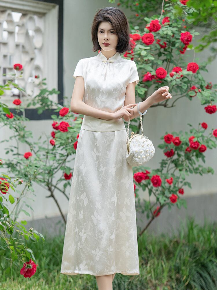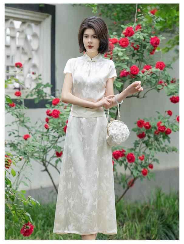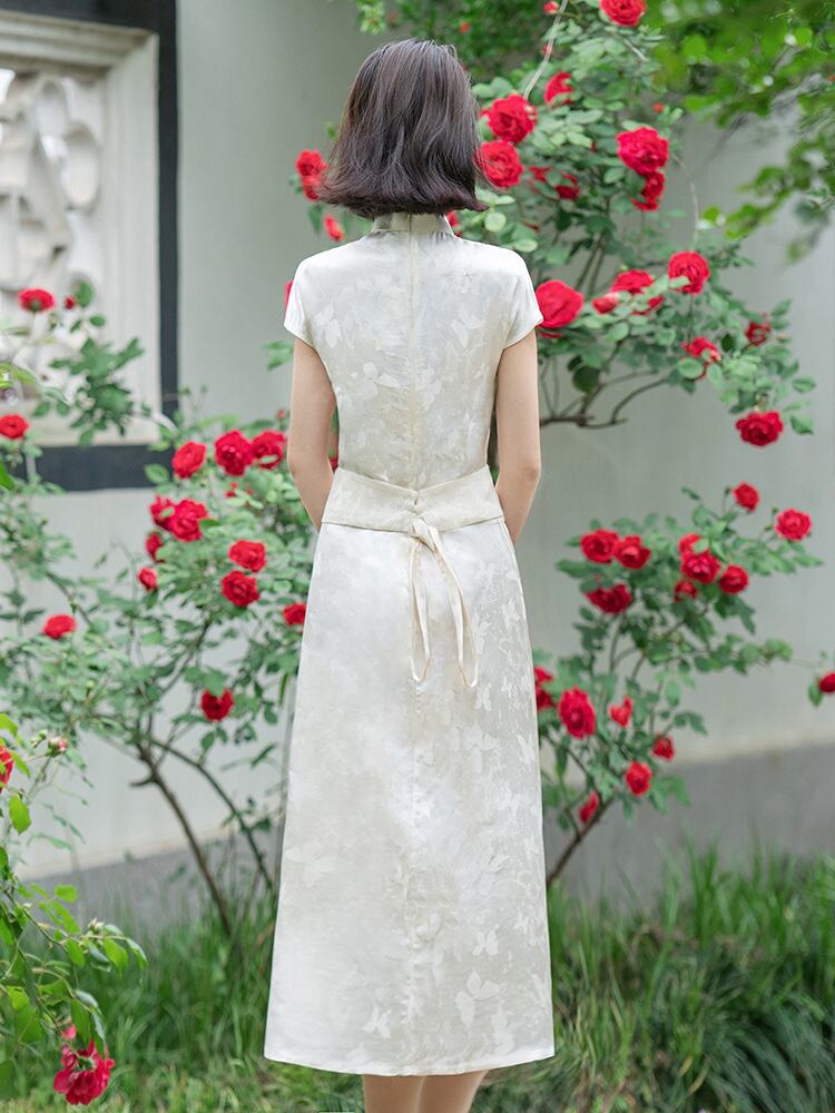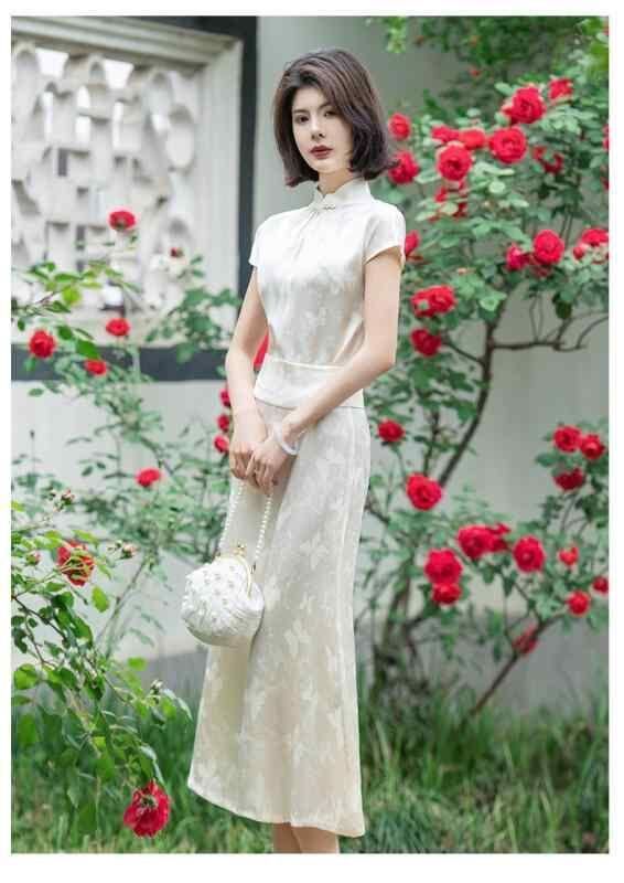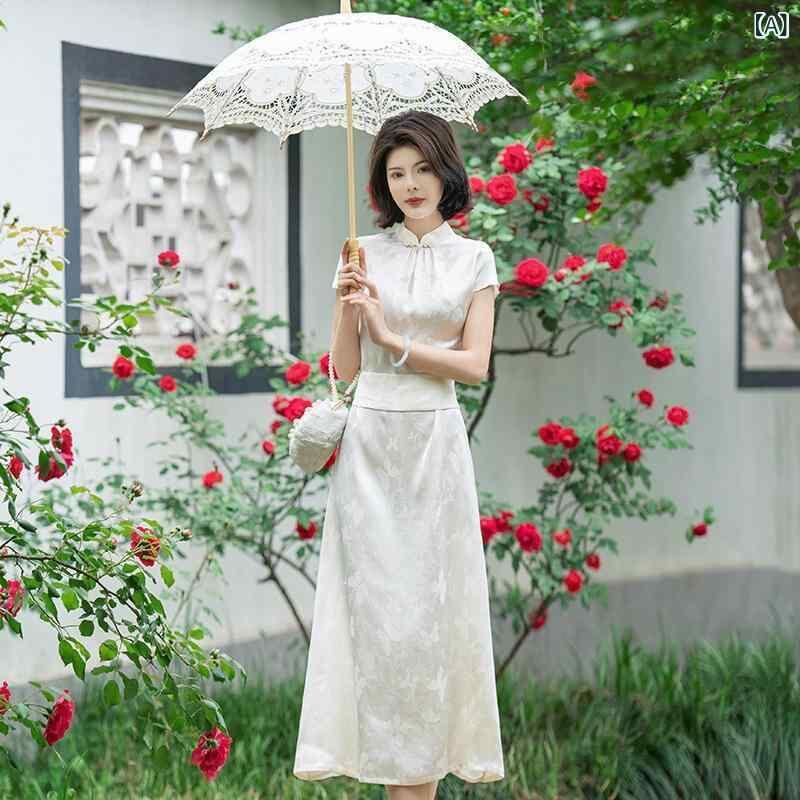 チャイナドレス レディース 新中華風 レトロモダン エレガント 上品 ロング丈 スリムフィット 体型カバー ジャカード織り スタンドカラー 七分袖 オフホワイト 春夏