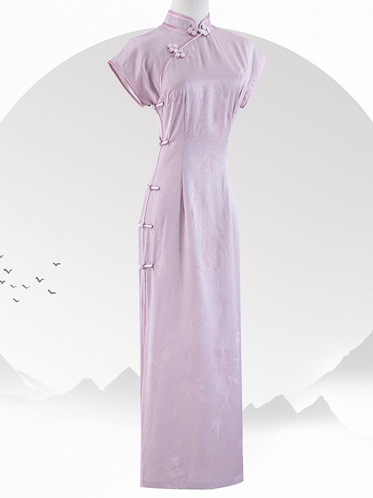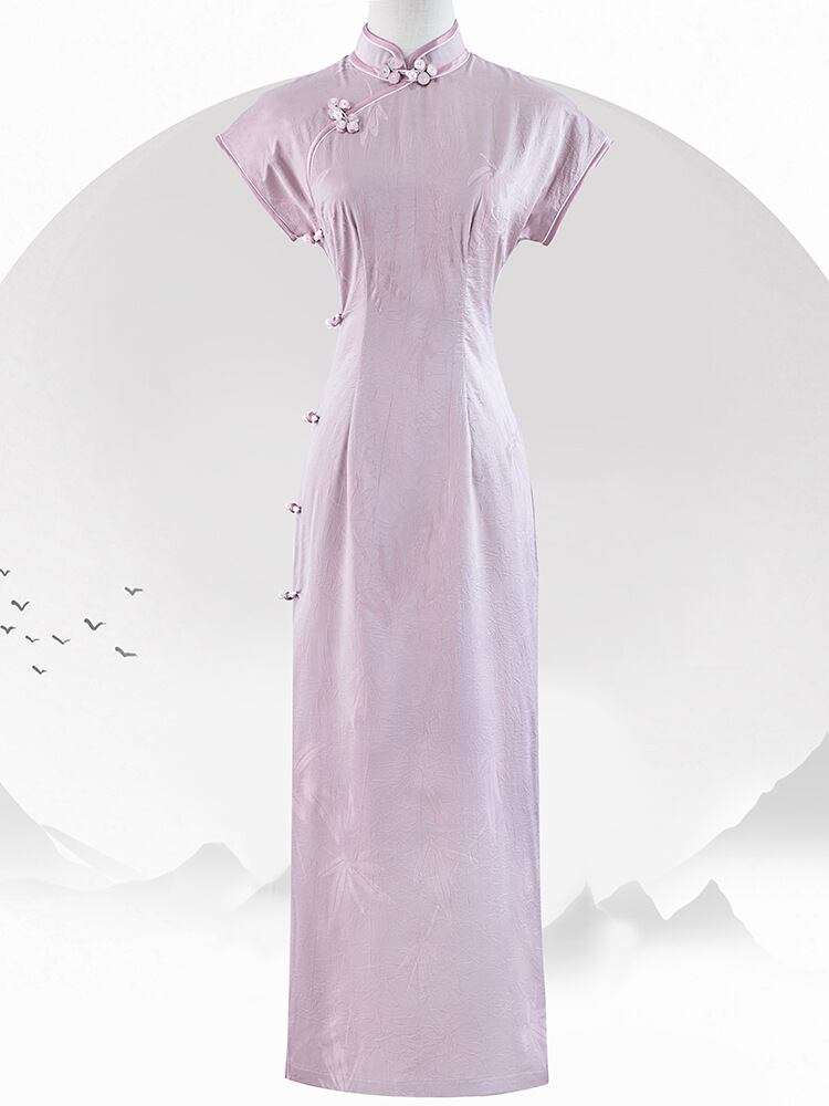 チャイナドレス レディース ピンク 新中式 モダンチャイニーズ 改良デザイン 高級感 上品 エレガント サテン生地 ポリエステル スタンドカラー 3分袖 スリット入り ロングワンピース 夏