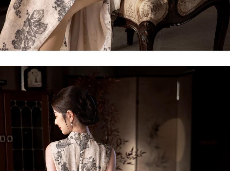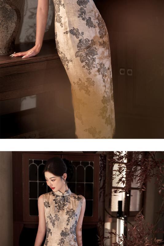 チャイナドレス レディース モダンチャイニーズスタイル 改良型 ノースリーブ ロング丈 ワンピース ドレス エレガント 上品 気品 グレー 春夏 ポリエステル 再生繊維 微ストレッチ フォーマル パーティー