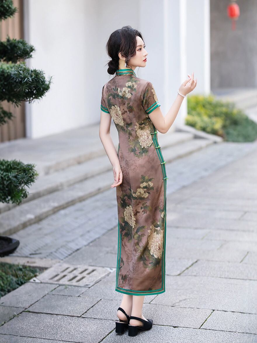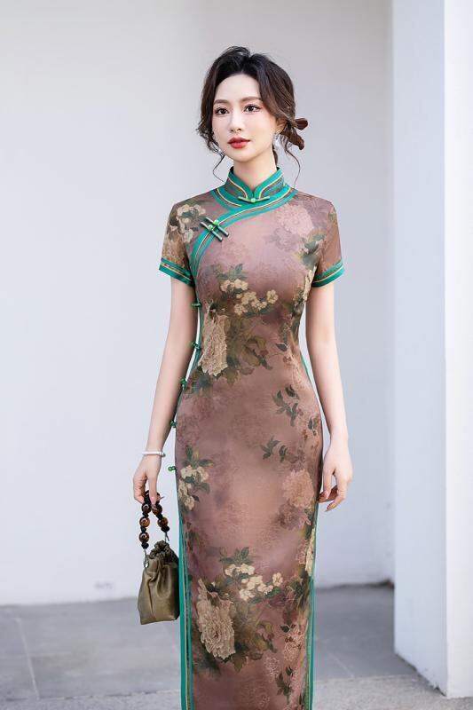 チャイナドレス レディース 春夏 ロング丈 新チャイナ風 レトロ オールド上海風 香雲紗風 スタンドカラー 三分袖 ハイサイドスリット パイピング エレガント 微弾性 ポリエステル スパンデックス パーティー ドレス 発表会