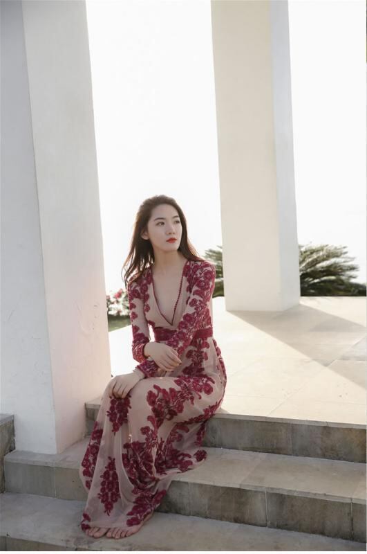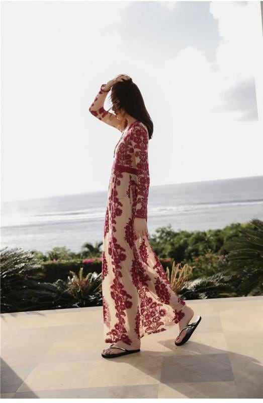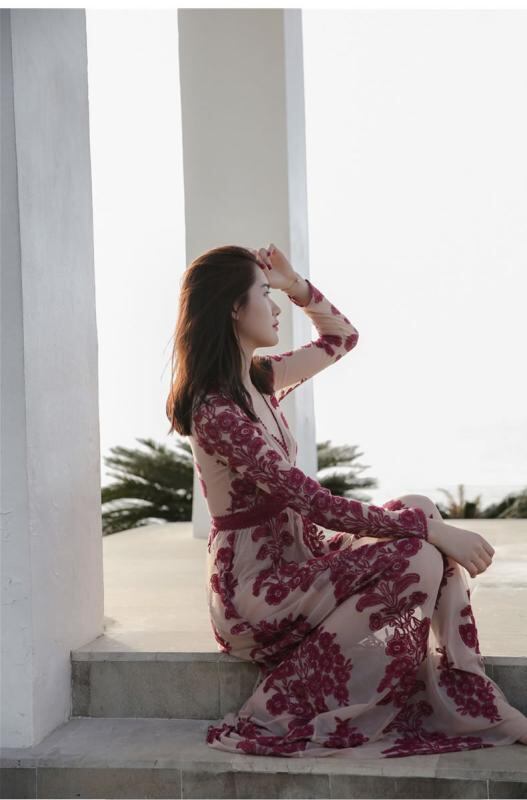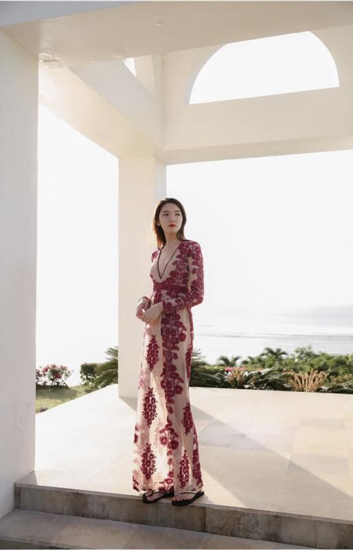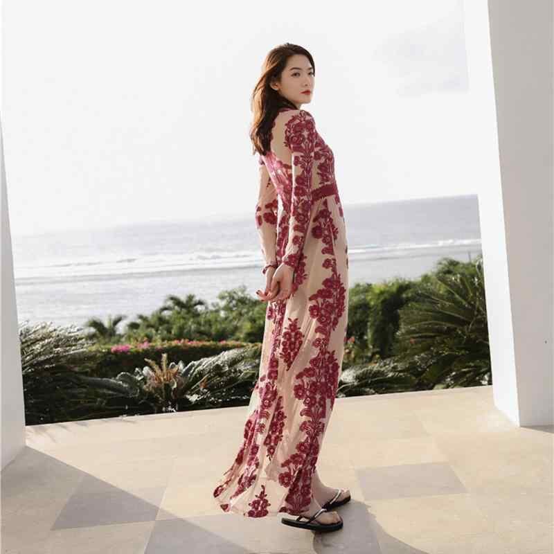 ワンピース 春夏 ボヘミアン キャミソール ビーチ リゾート マキシ丈 レース Vネック Aライン 無地 切り替え ポリエステル フェミニン 赤 青