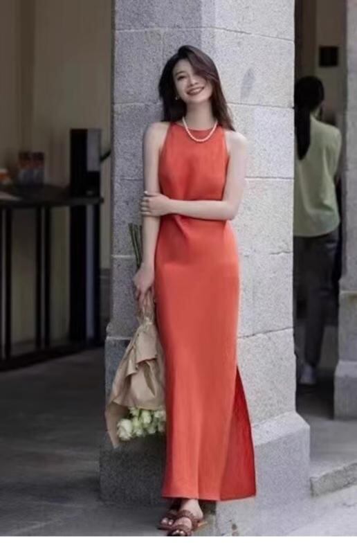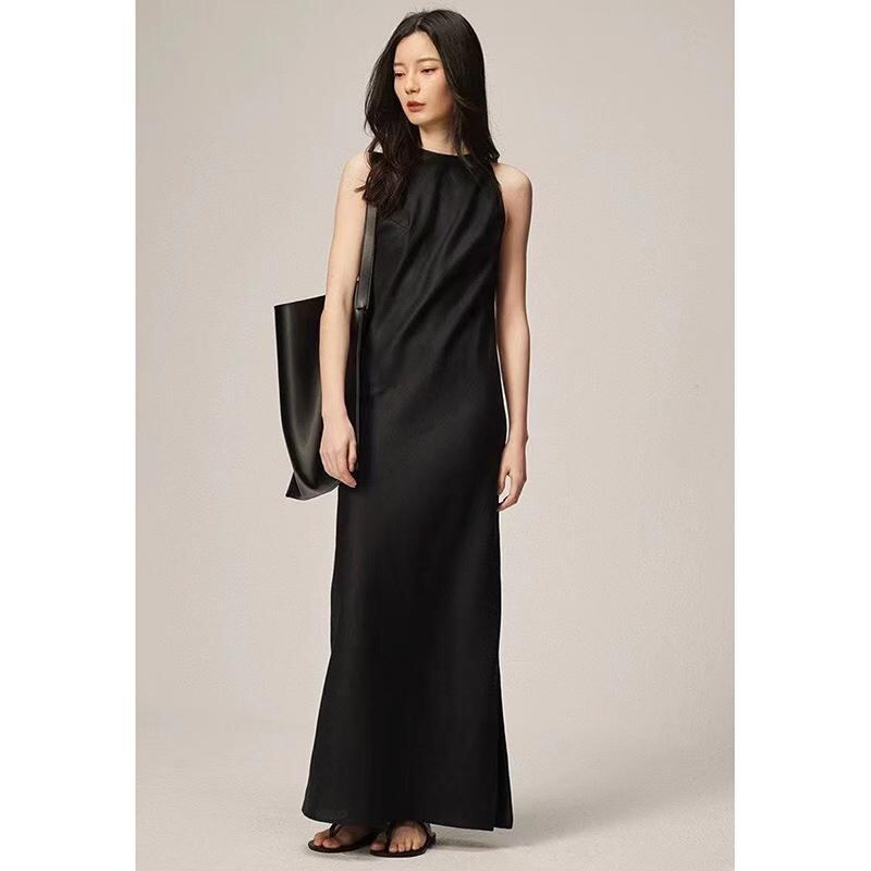 ワンピース レディース 麻 リネン 高品質 ラウンドネック ノースリーブ 無地 スリムフィット スリット ロング丈 マキシ丈 シンプル エレガント 上品 通勤 オフィス 春夏