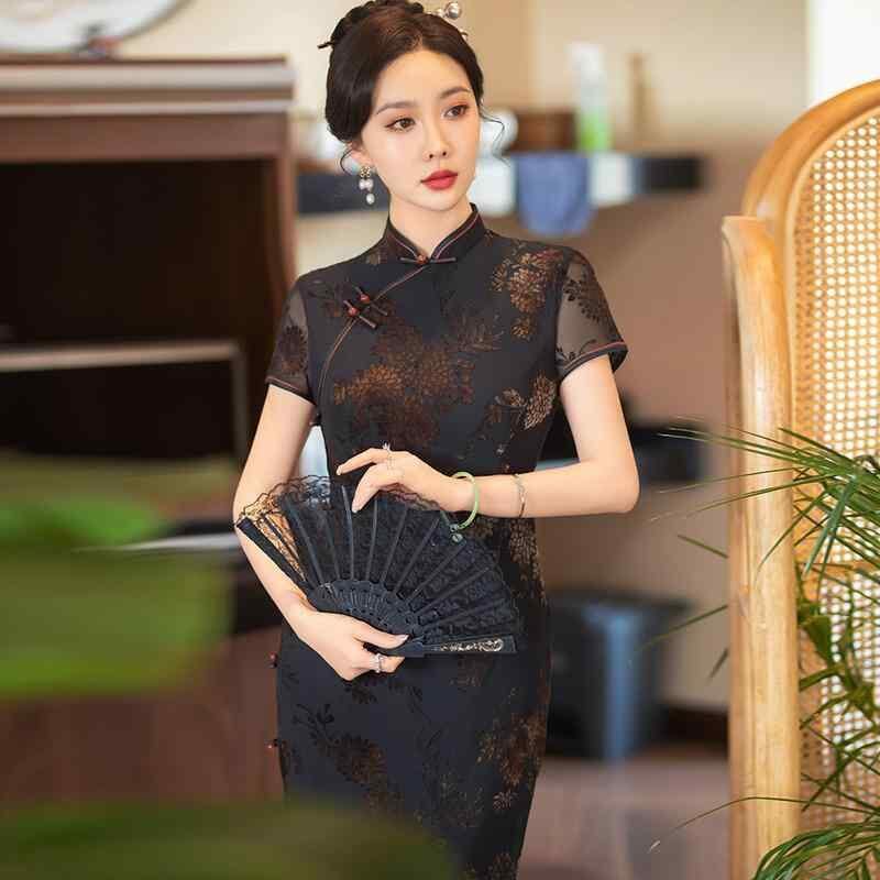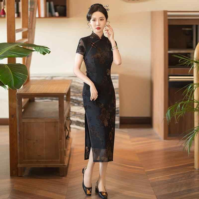 チャイナドレス レディース 女性用 ブラック 中国風 モダン 改良 ロング丈 上海レトロ 半袖 普段使い カジュアル 春夏 フロッキー ポリエステル スタンドカラー 斜め襟 立体柄 3Dデザイン 花柄