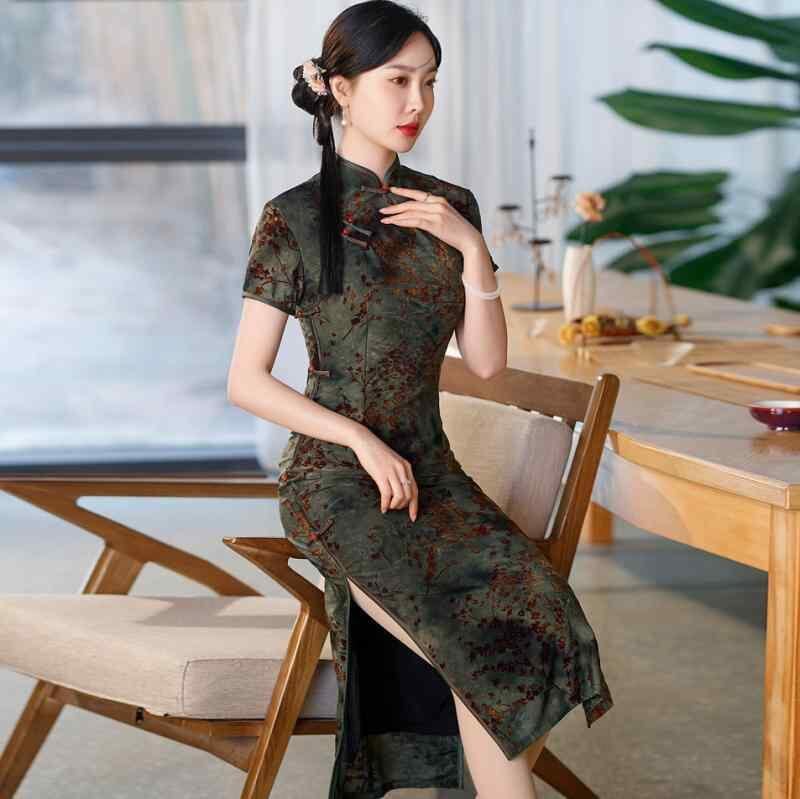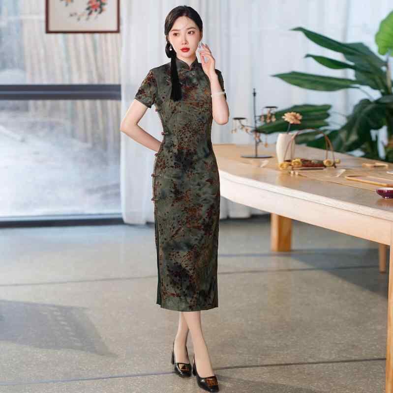 チャイナドレス レディース レトロ 上海風 改良型 ロング丈 スリム 半袖 スタンドカラー 斜め襟 ロー スリット 植毛素材 ポリエステル 日常使い 普段使い 春夏 グリーン レッド