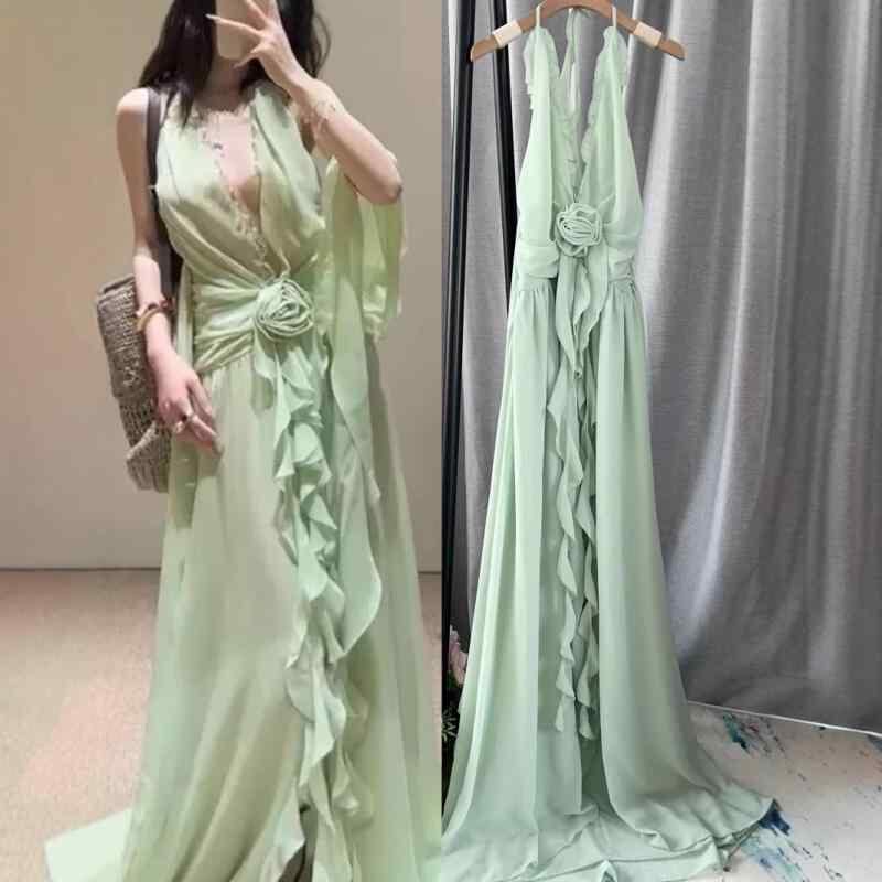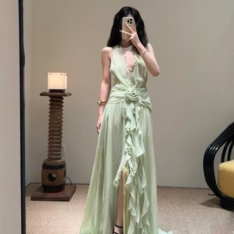 ワンピース レディース 春夏 ビーチ リゾート 旅行 ロング丈 マキシ丈 ウエストマーク フリル ラッフル ハルターネック ノースリーブ 花柄 プリント ポリエステル エレガント きれいめ ライトグリーン アシンメトリー