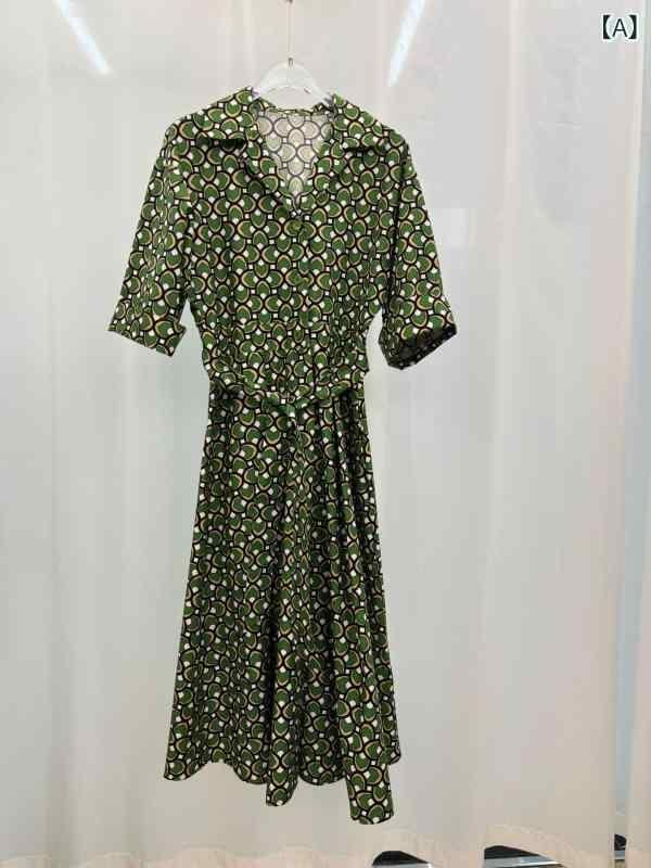 ワンピース レディース 春夏 レトロ 総柄プリント ロング丈 切り替え ラウンドネック 5分袖 コットン ゆったり デイリーユース カジュアル グリーン ミドルウエスト