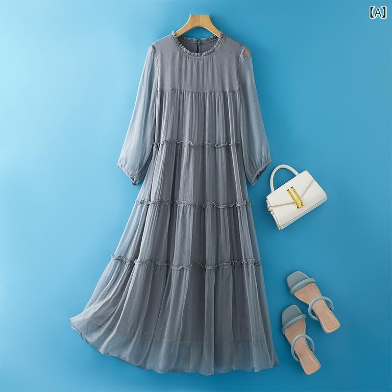 ワンピース レディース シルク エレガント ミディ丈 プルオーバー 無地 フリル ラウンドネック 五分袖 切り替え ゆったり リラックスフィット フェミニン 春夏 リゾート