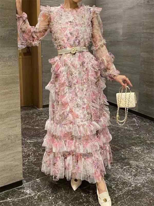 ワンピース ロングドレス レディース 花柄 チュール フリル 重厚感 デザイン性 ドリーミー エレガント マキシ丈 ハイウエスト ティアード ポリエステル ピンク 春夏 パーティー 結婚式 お呼ばれ