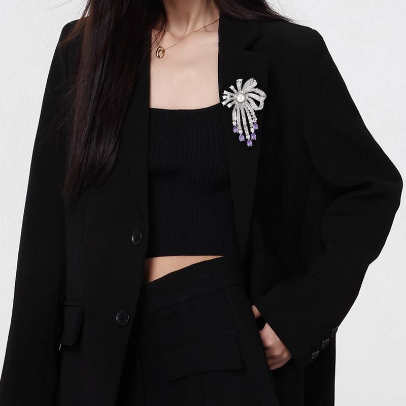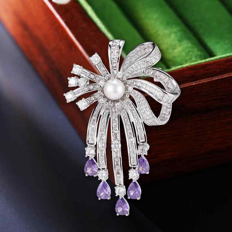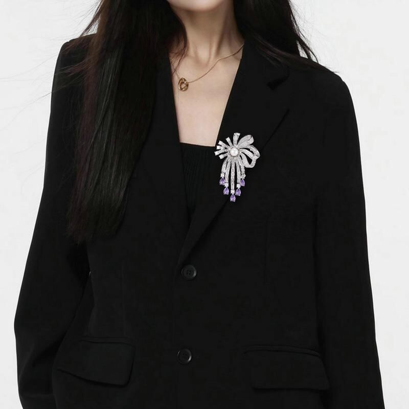 ブローチ レディース 淡水パール ジルコニア フラワー タッセル 高級感 豪華 銅製 電気メッキ加工 シルバー パープル 春 フォーマル 普段使い パーティー ドレスアップ アクセサリー