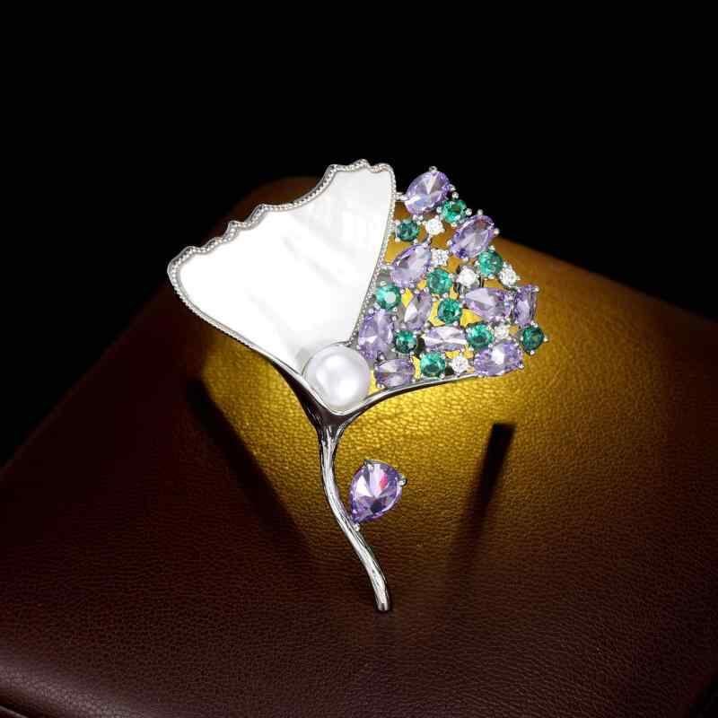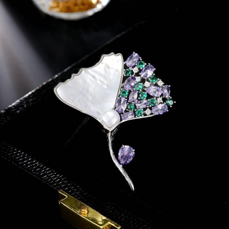 ブローチ レディース 天然真珠貝 イチョウモチーフ 高級感 上品 エレガント 電気メッキ加工 コート ジャケット スーツ用 ライトラグジュアリー ホワイト パープル