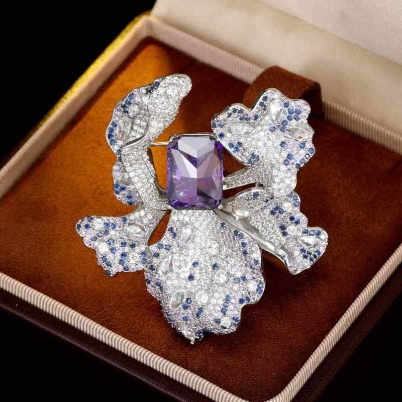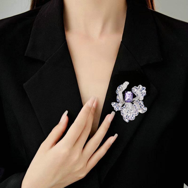 ブローチ レディース フレンチスタイル 高級感 アイリス ジルコニア カラーストーン マイクロパヴェセッティング 花モチーフ パープル 銅製 電気メッキ加工 ファッション 通勤 フォーマル ドレスアップ スーツ コート