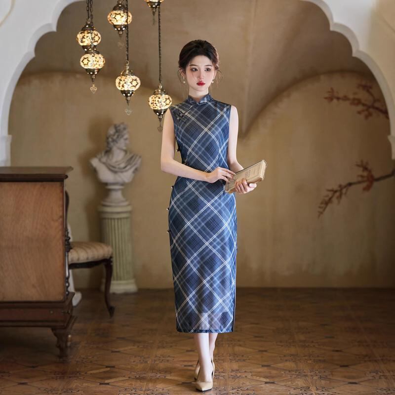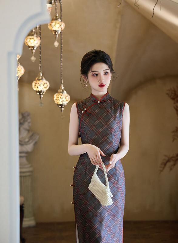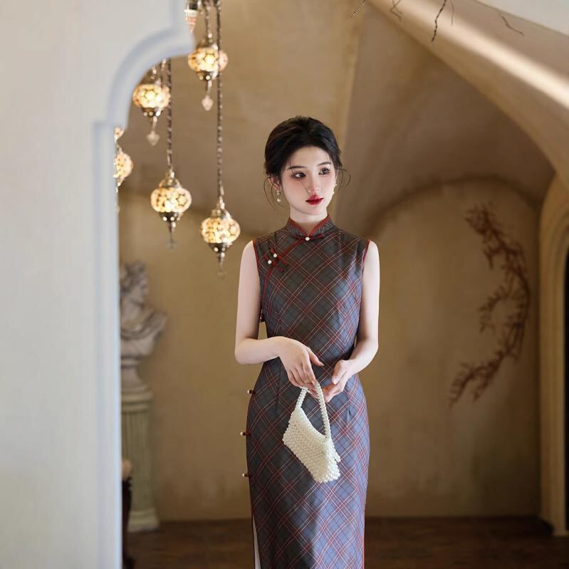 チャイナドレス ノースリーブ スタイリッシュ レディース 赤色 チェック柄 新チャイナ風 レトロ風 クラシック ワンピース ドレス 普段着 デイリー