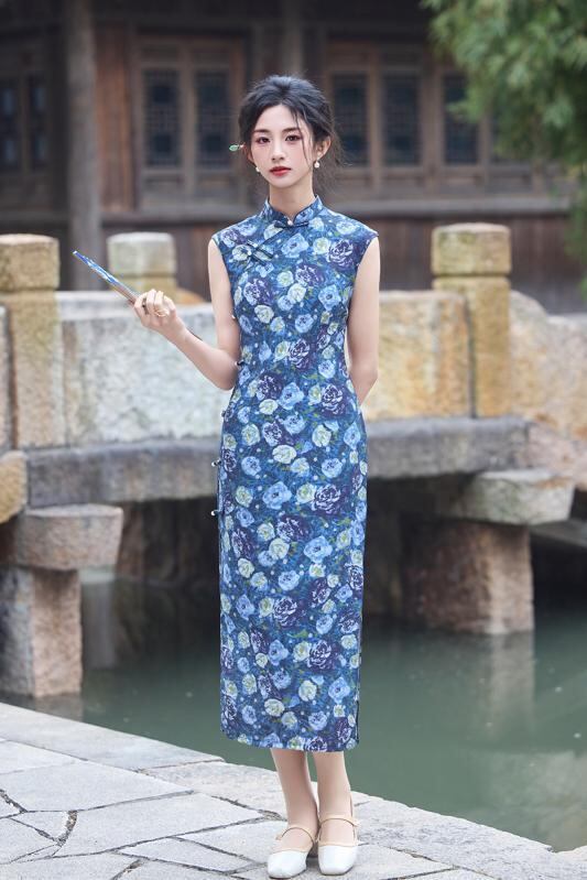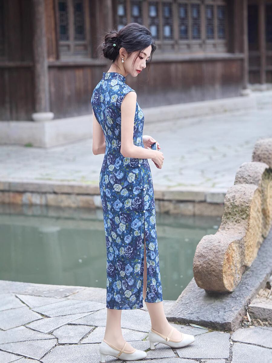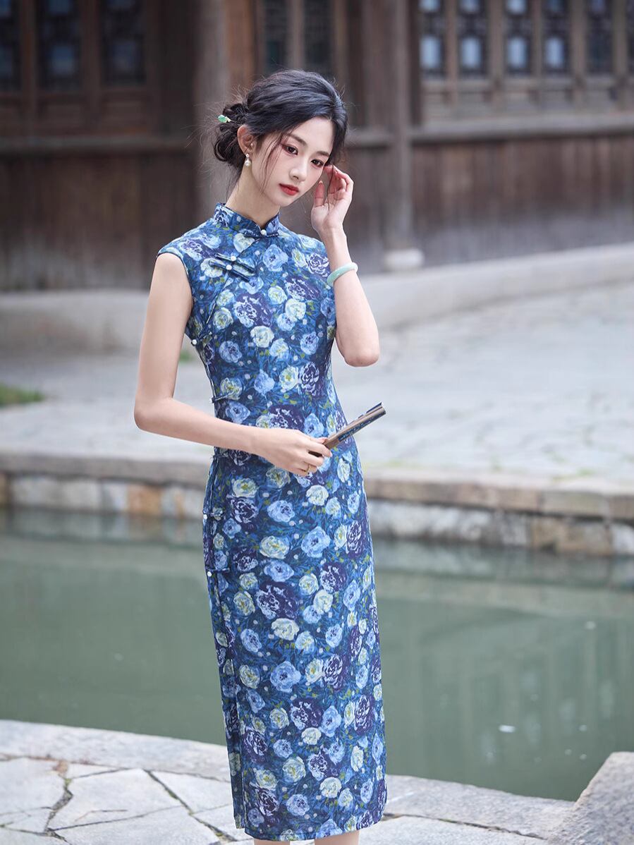 チャイナドレス ノースリーブ スタイリッシュ レディース 中国風 夏季 夏物 青色 ブルー 新中華風 ネオチャイニーズ モダン レトロ 袖なし ミドル丈 膝丈 ワンピース ドレス