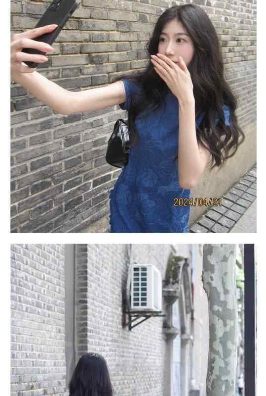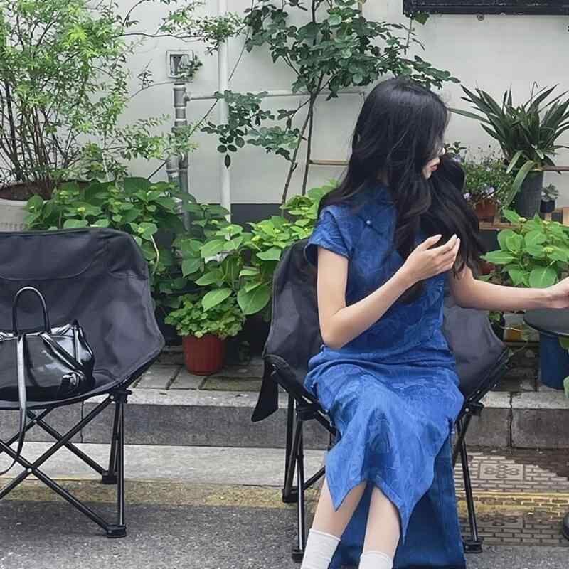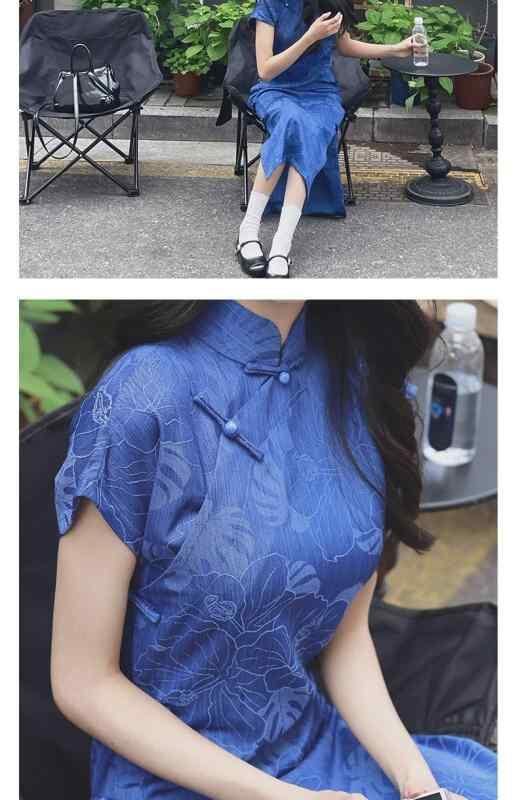 チャイナドレス レディース 藍色 古風 レトロモダン エレガント ショート丈 ゆったり 普段使い デイリー コットン 綿 ホルターネック フリル袖 ストレッチ 都市スタイル 上品通勤 春夏