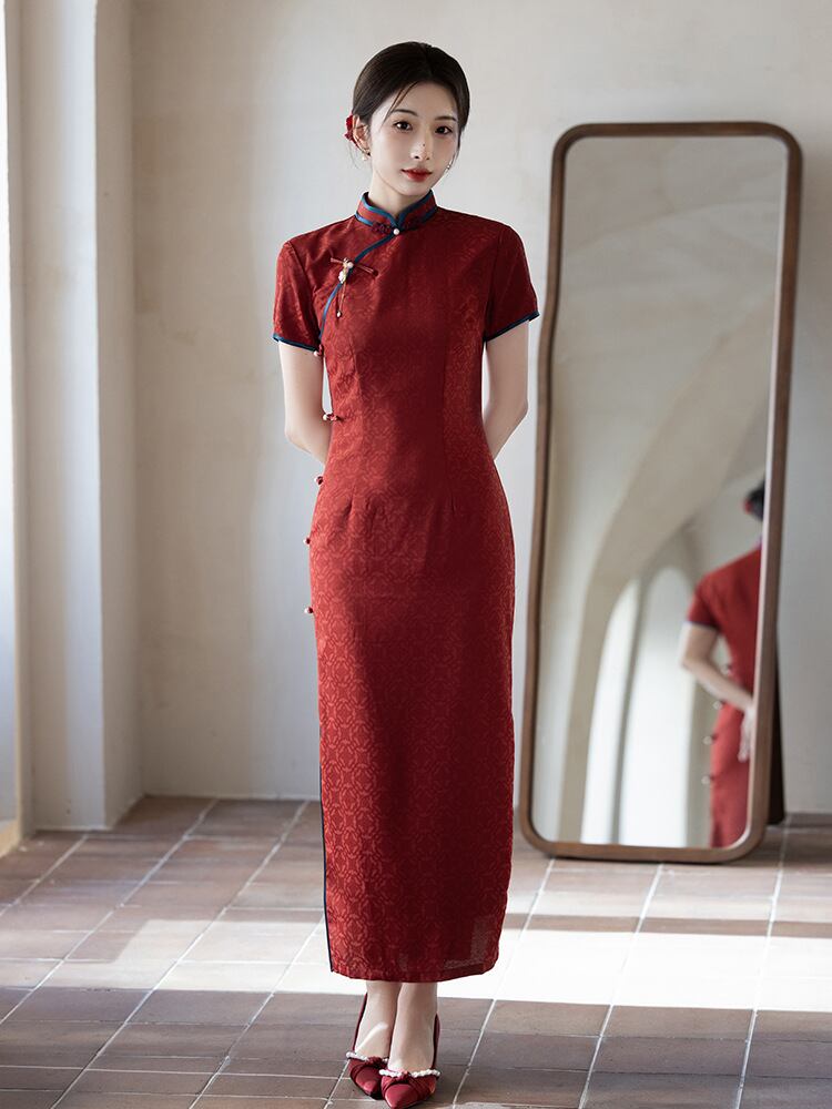 チャイナドレス レディース 花嫁 披露宴 婚礼衣装 新中国風 高級感 ジャカード ロング丈 スタンドカラー 七分袖 ハイサイドスリット 再生繊維 レッド 春夏