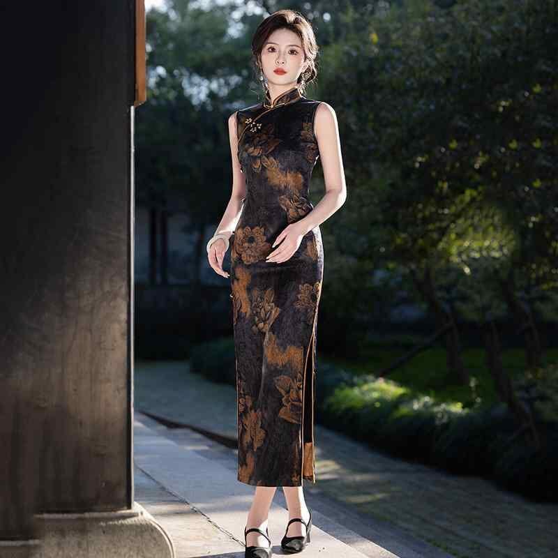 チャイナドレス レディース ノースリーブ ロング丈 着痩せ効果 新中式 改良型 レトロ 上海風 スリムフィット 春夏 アセテートサテン ポリエステル スタンドカラー 斜め襟 スリット入り