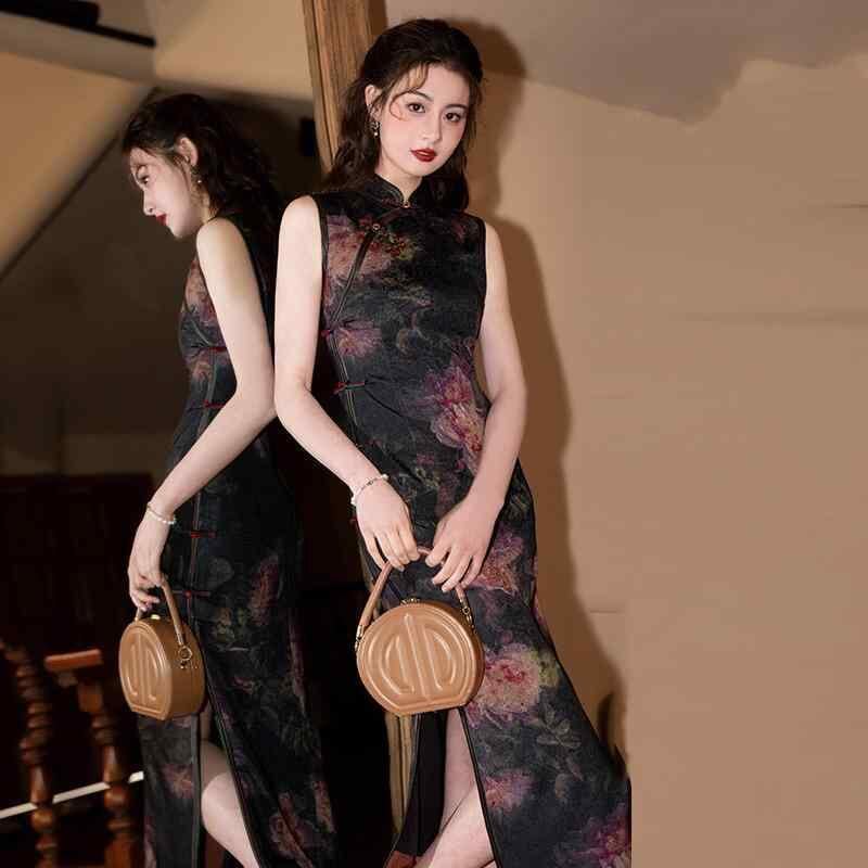 チャイナドレス レディース 改良 ノースリーブ ロング丈 着痩せ スリムフィット オールド上海 レトロ 中国風 ネオチャイナ ポリエステル スタンドカラー サイドスリット アセテートサテン 春夏