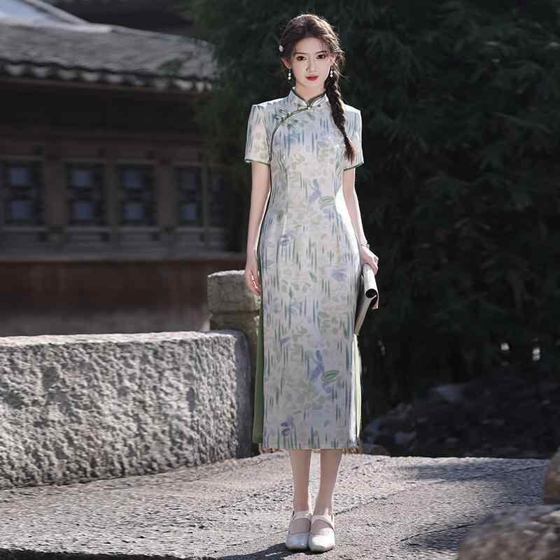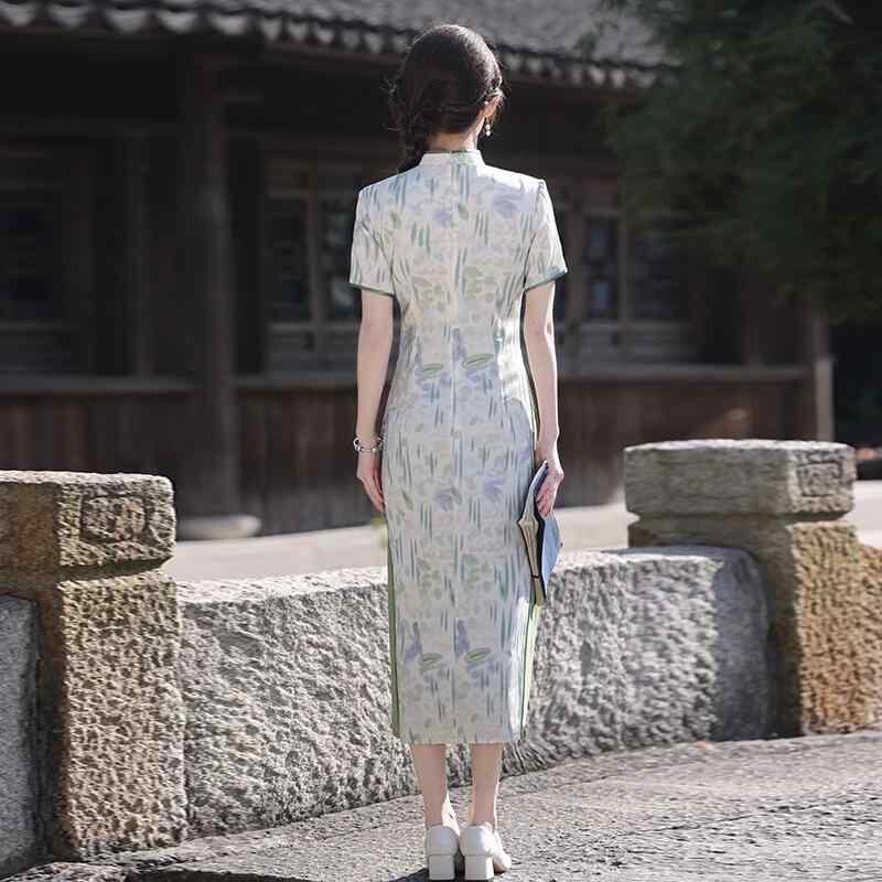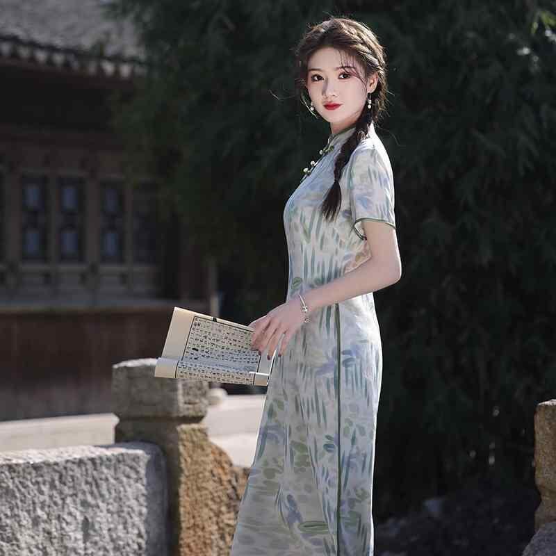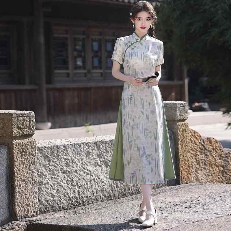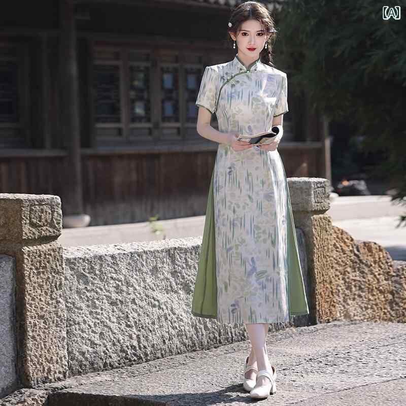 チャイナドレス レディース 改良型 ロング丈 普段使い デイリーユース カジュアル 若者向け ポロ襟 半袖 エレガント 上品 清楚 爽やか フェミニン ホワイト グリーン 春夏