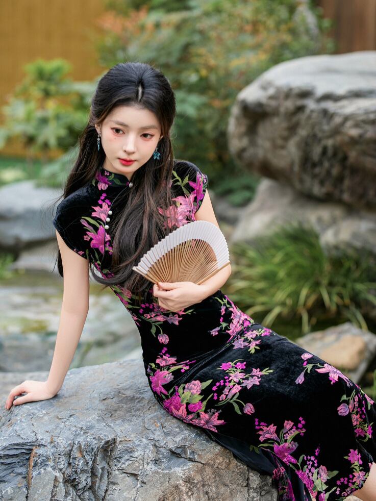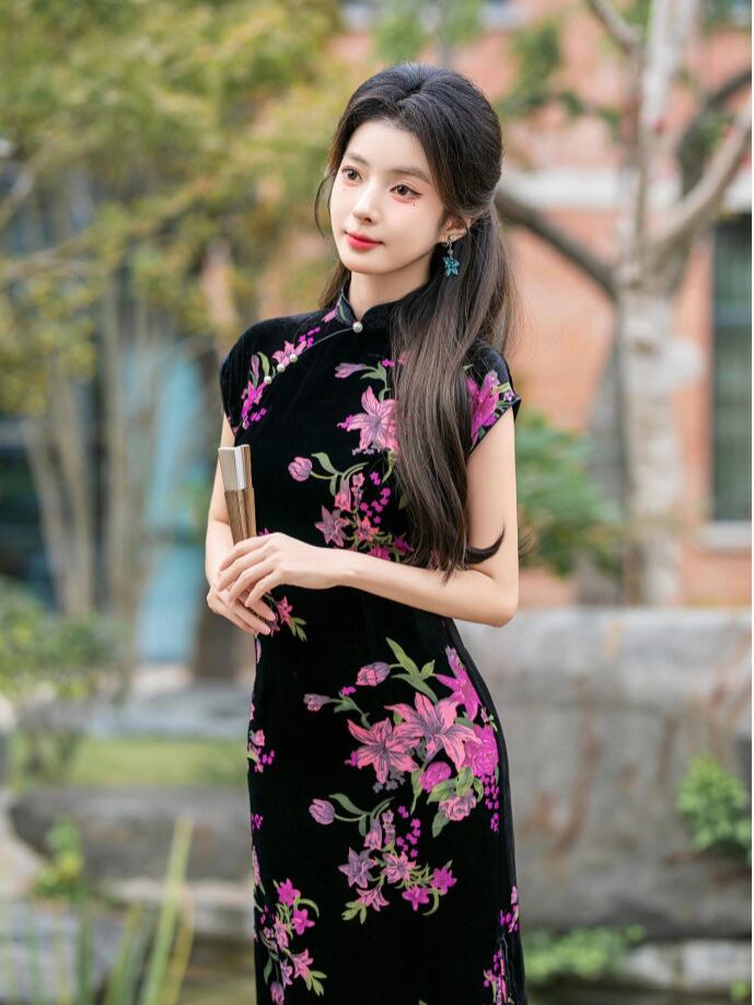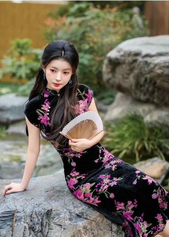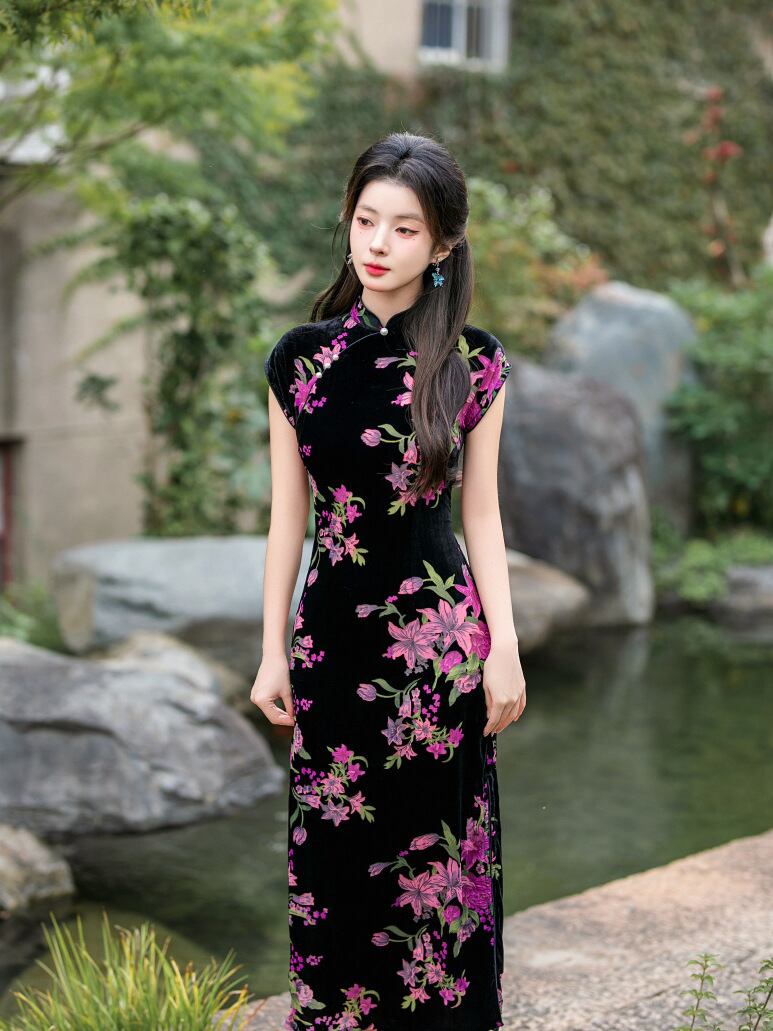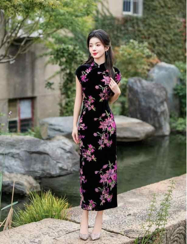 チャイナドレス レディース 春夏 爛花ベルベット ロング丈 二重 改良型 エレガント 普段使い スタンドカラー 斜め合わせ 低めスリット ワンピース