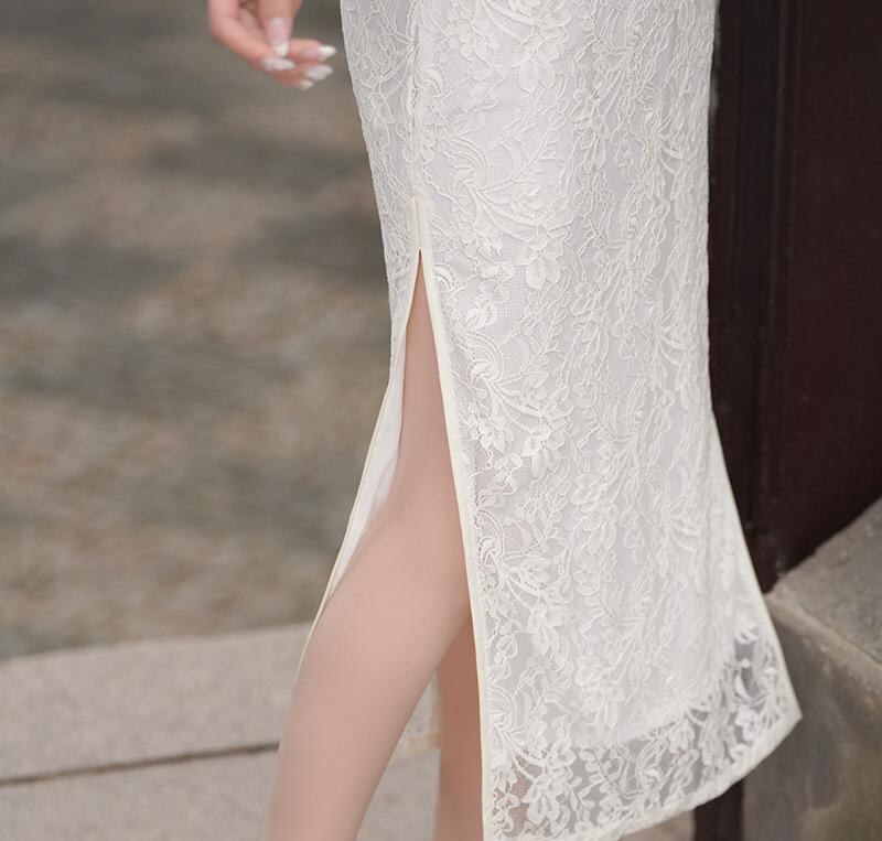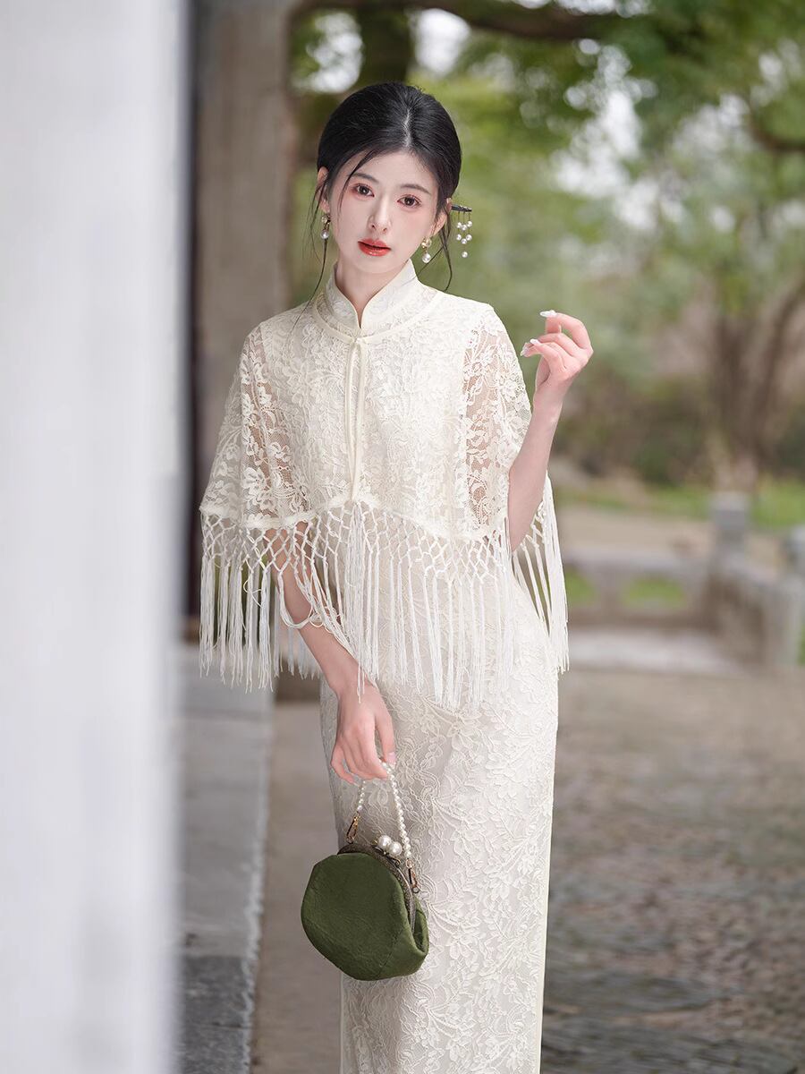 チャイナドレス 女性用 春夏 無地 エレガント 上品 2点セット ショール付き ロング丈 ノースリーブ セミハイネック レース ポリエステル 伸縮性 結婚式 披露宴 パーティードレス お呼ばれ 清楚